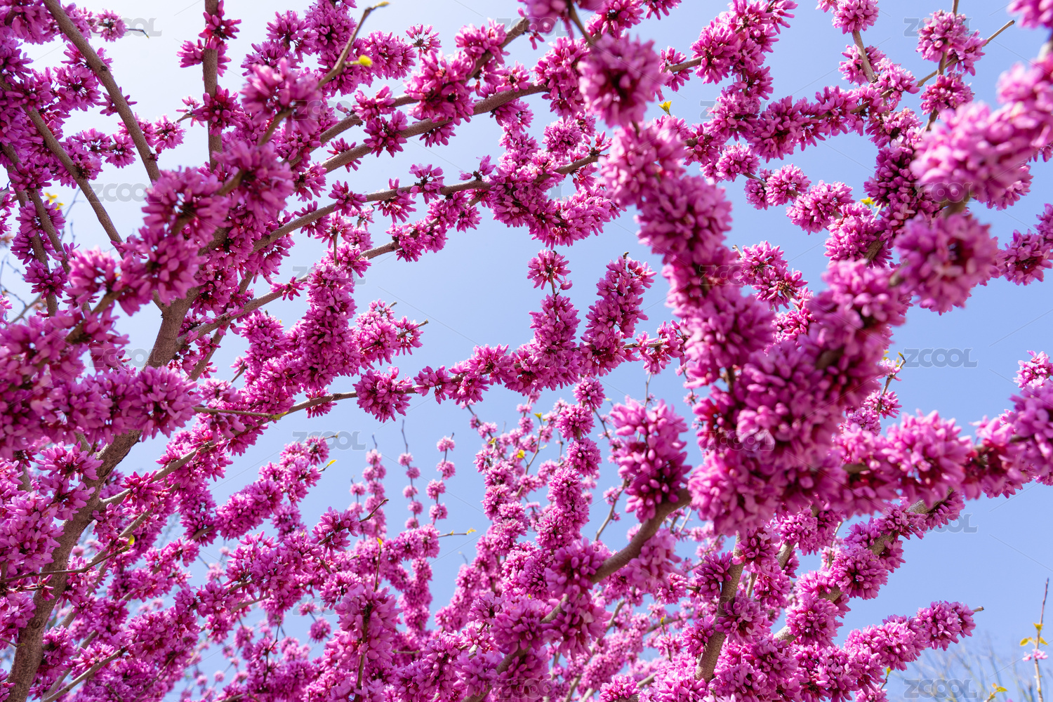 初春盛开的紫荆花挂满晶莹剔透的露珠特写