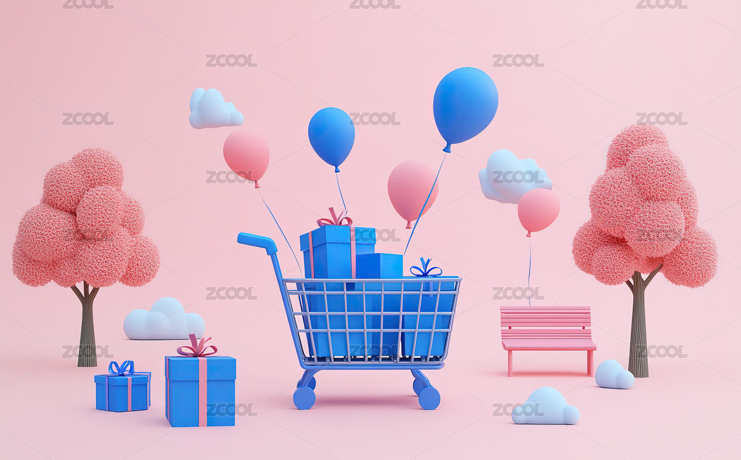 粉色购物车与礼品盒