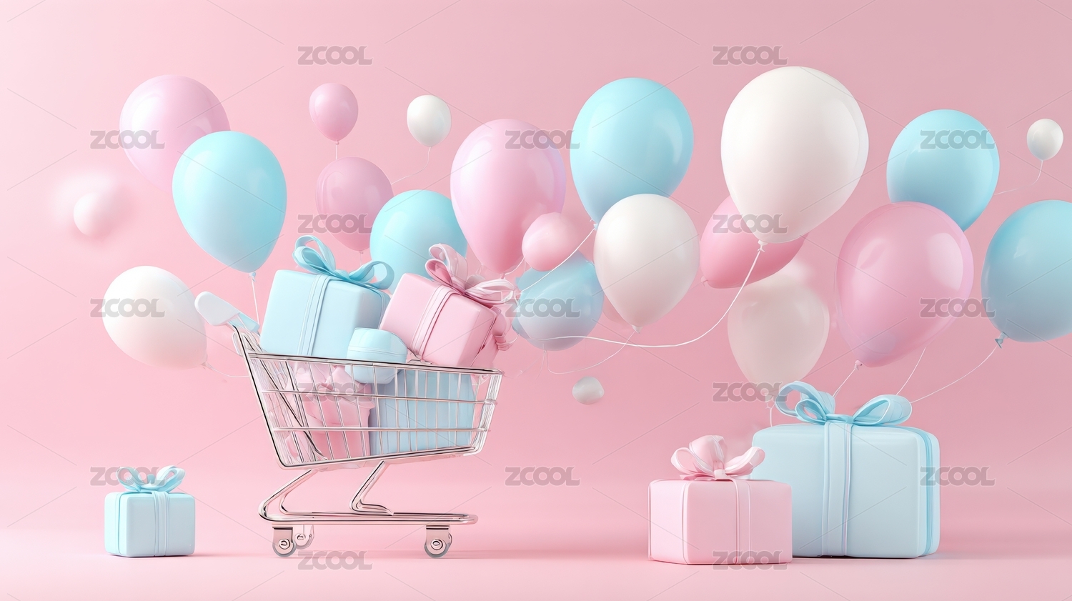 粉红色背景下的气球和购物车特写镜头