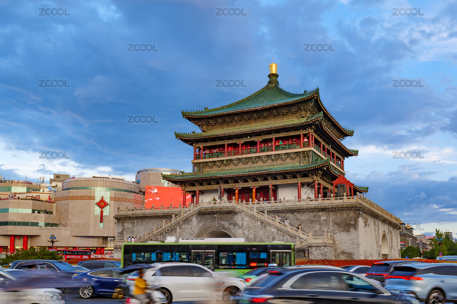 中国陕西西安钟鼓楼黄昏飞鸟人群夜景车流云彩