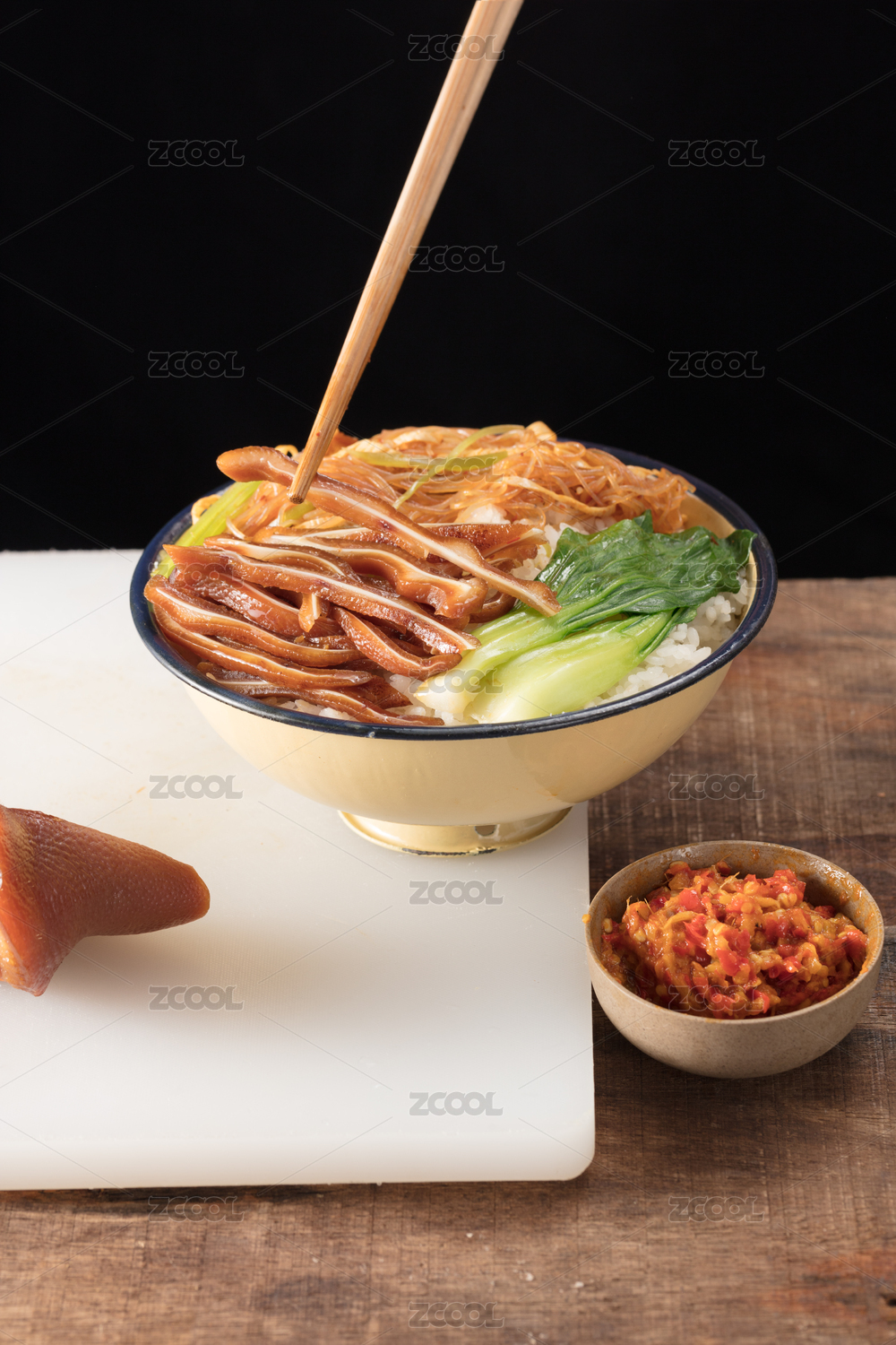 搪瓷碗里筷子夹着正在摆盘的卤猪耳套饭