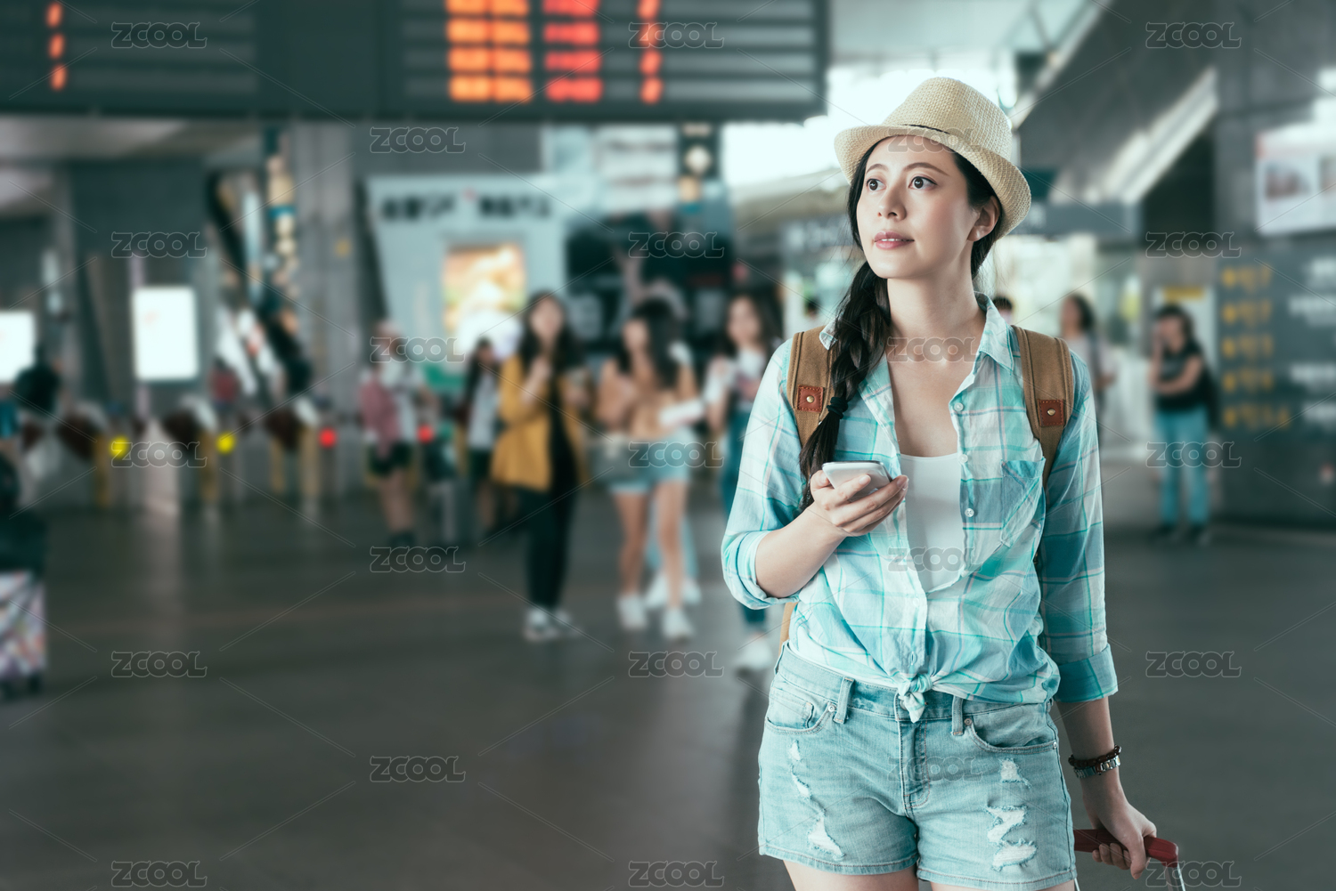 旅行者智能亚洲女子与行李步行和使用智能手机在火车终点站大厅模糊的人的背景。