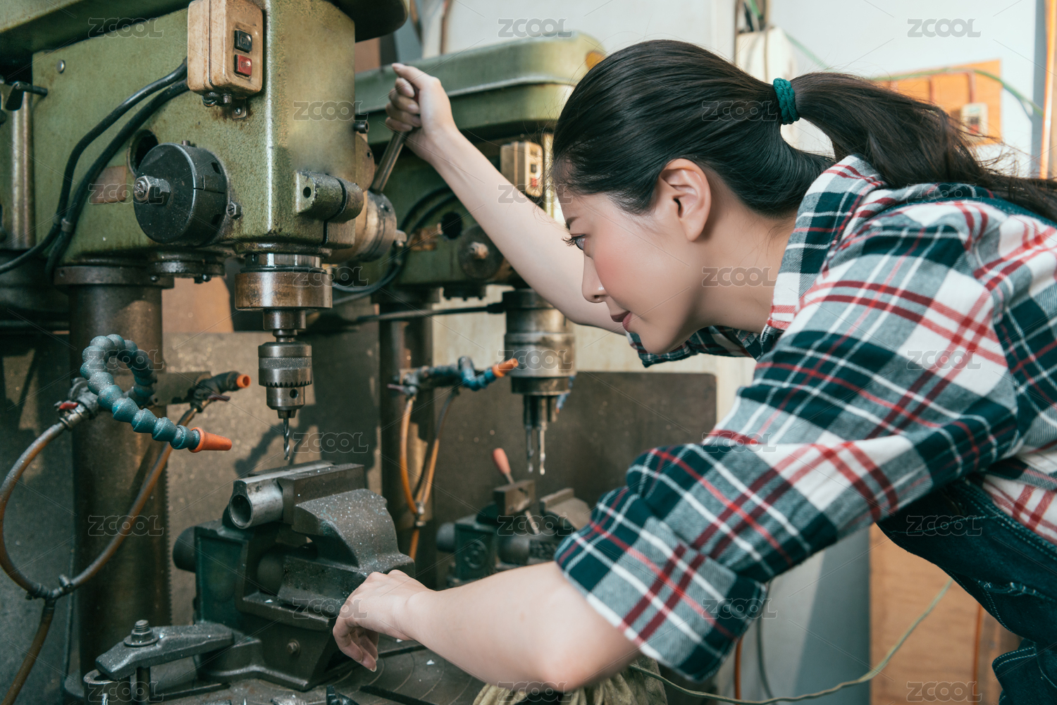 严重的工业厂房女人穿着安全防护眼镜着力调整机和铣刨机工作区看钻孔位置。