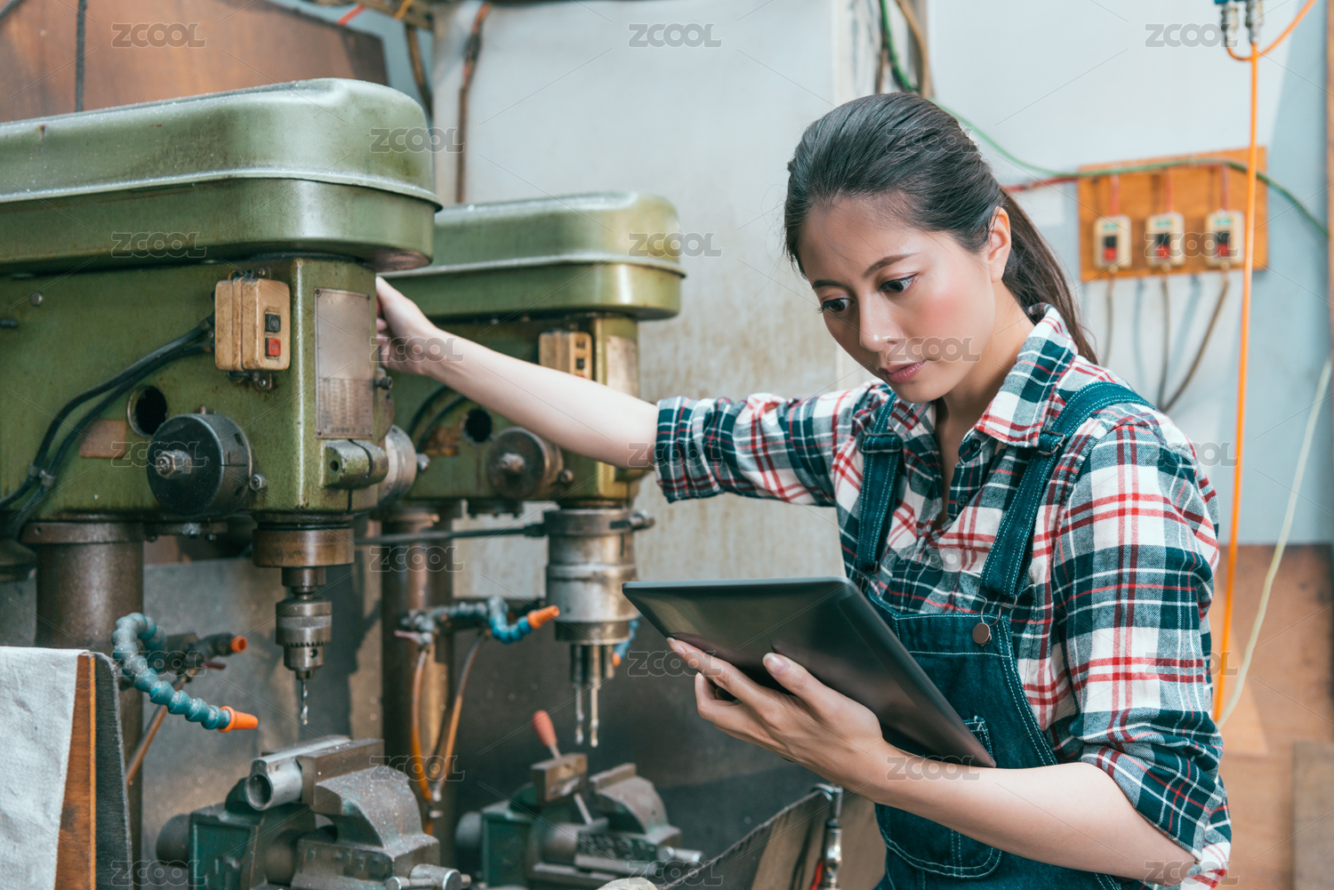 年轻漂亮的车床公司女首领控制钻孔机,并使用移动数字平板电脑确认处理状态。