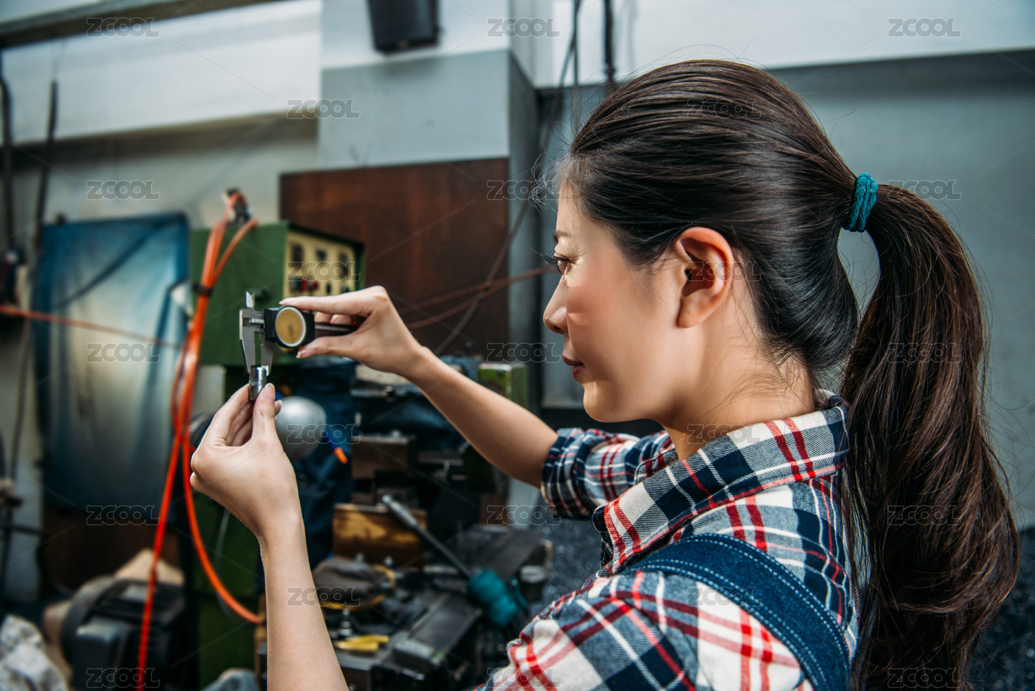 年轻貌美的铣削加工的女工戴着防护眼镜在机床厂工作,并用卡尺规模设备制造零件的精度。