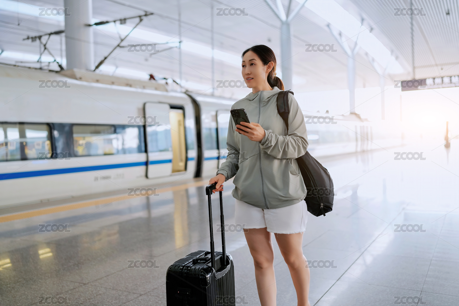 亚洲游客抵达妇女在车站的站台上高速铁路站在了目的地,拿着智能手机。假日旅游vactation概念。