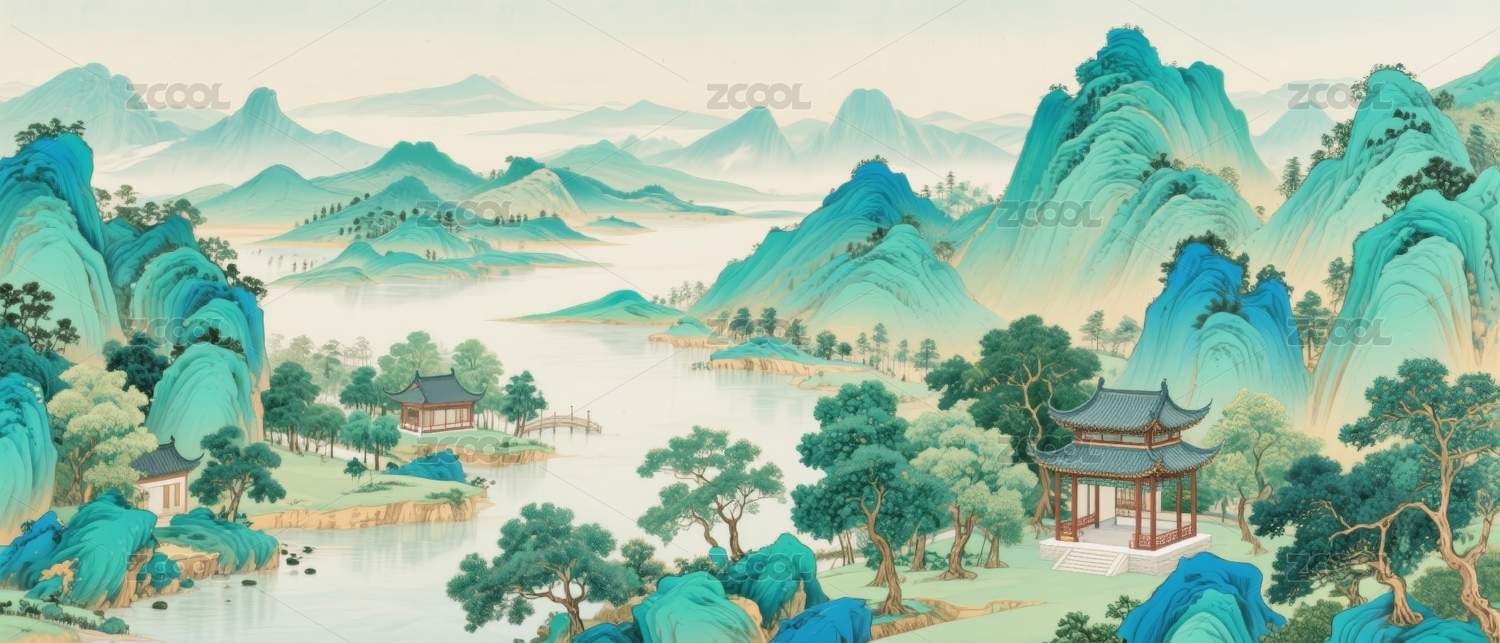 山水青绿古典园林场景