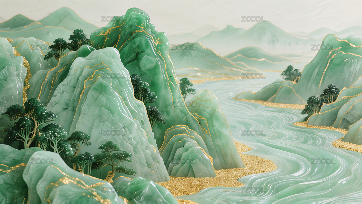 新中式3D立体翡翠山水画