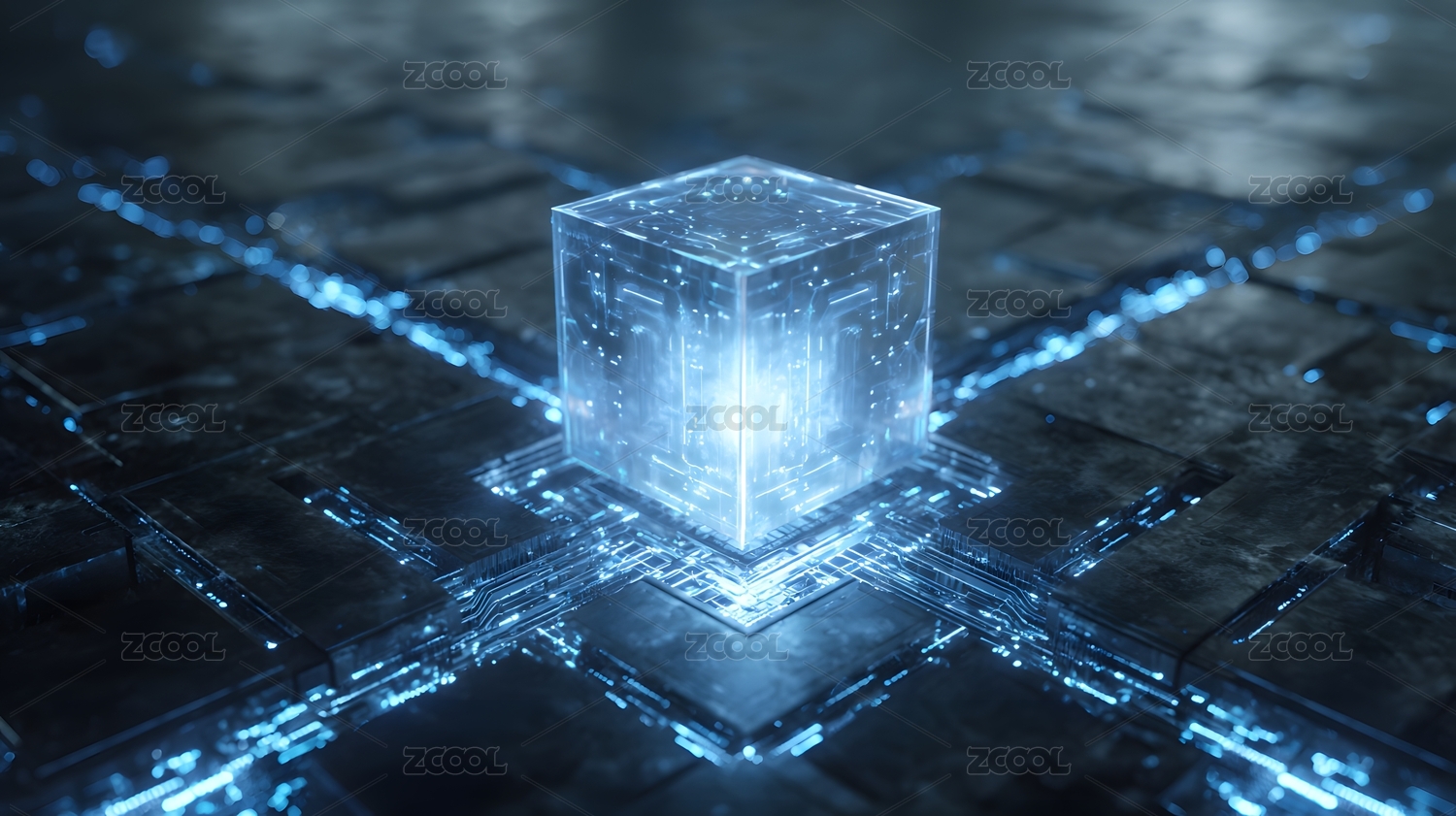 发光立方体与电路板的科技场景