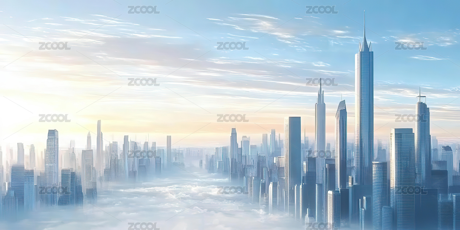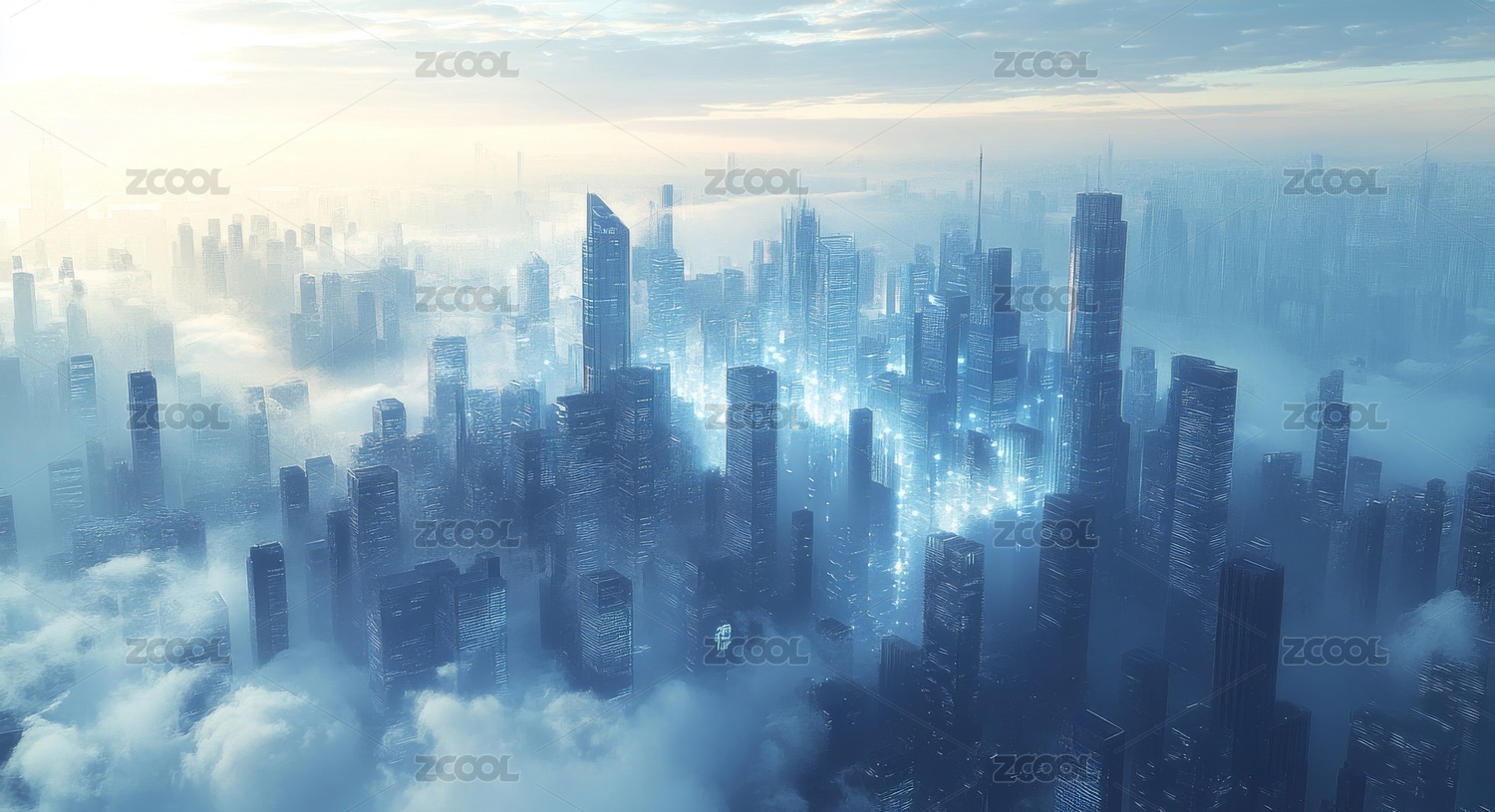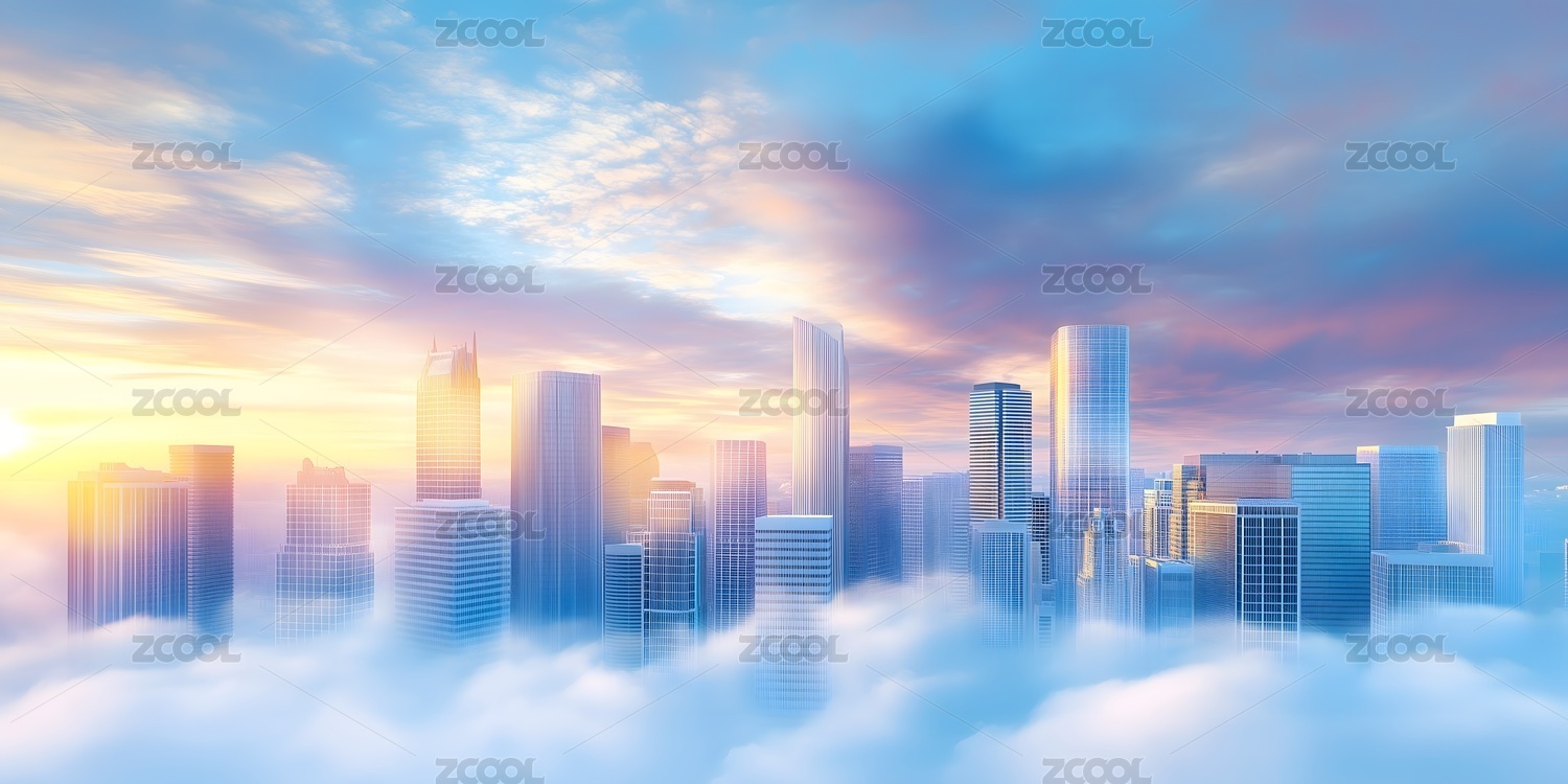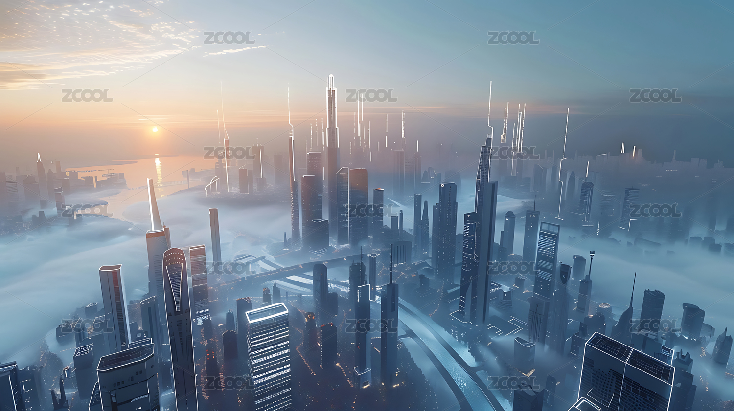 薄雾中阳光洒在摩天高楼上的城市早晨
