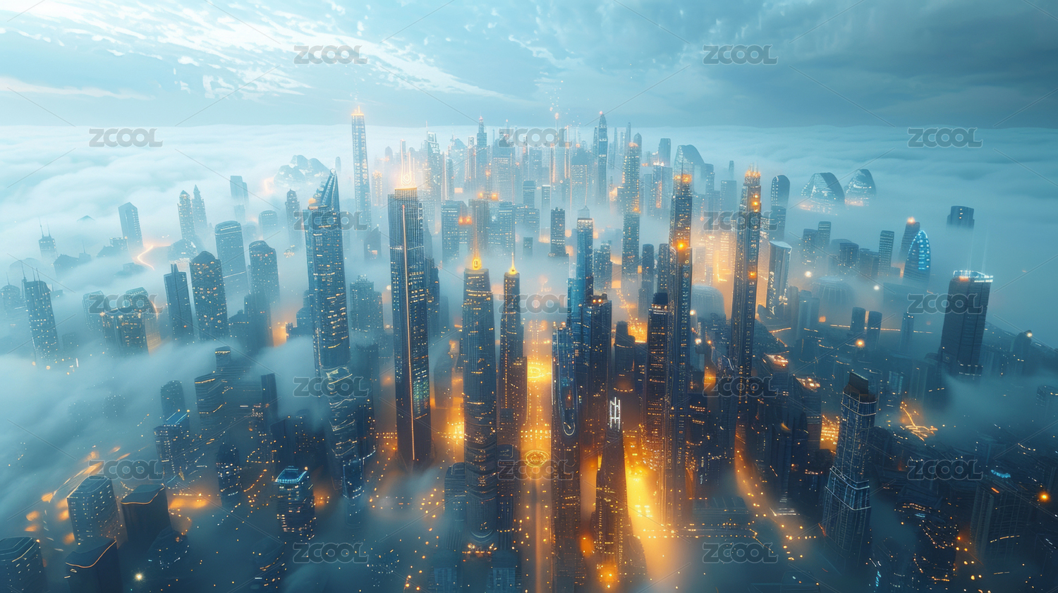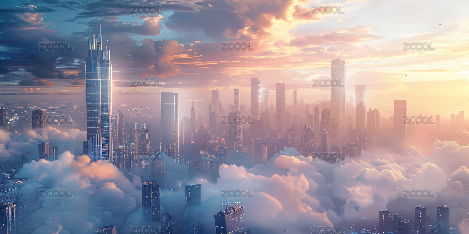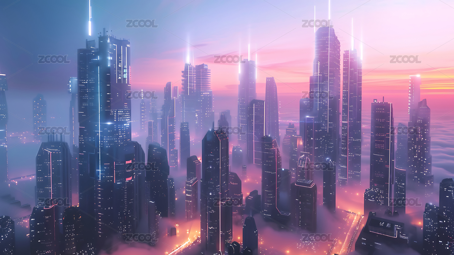 薄雾中阳光洒在摩天高楼上的城市早晨