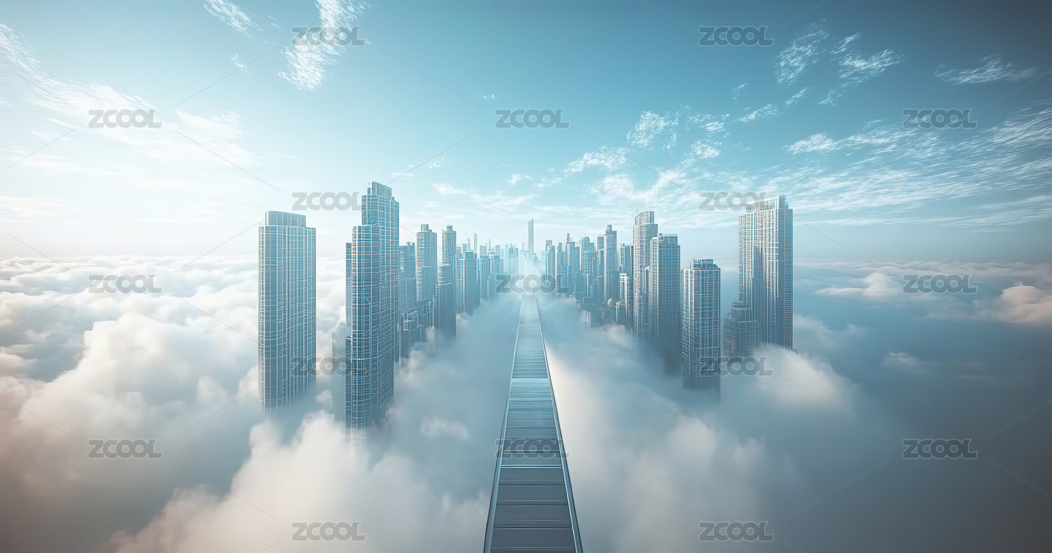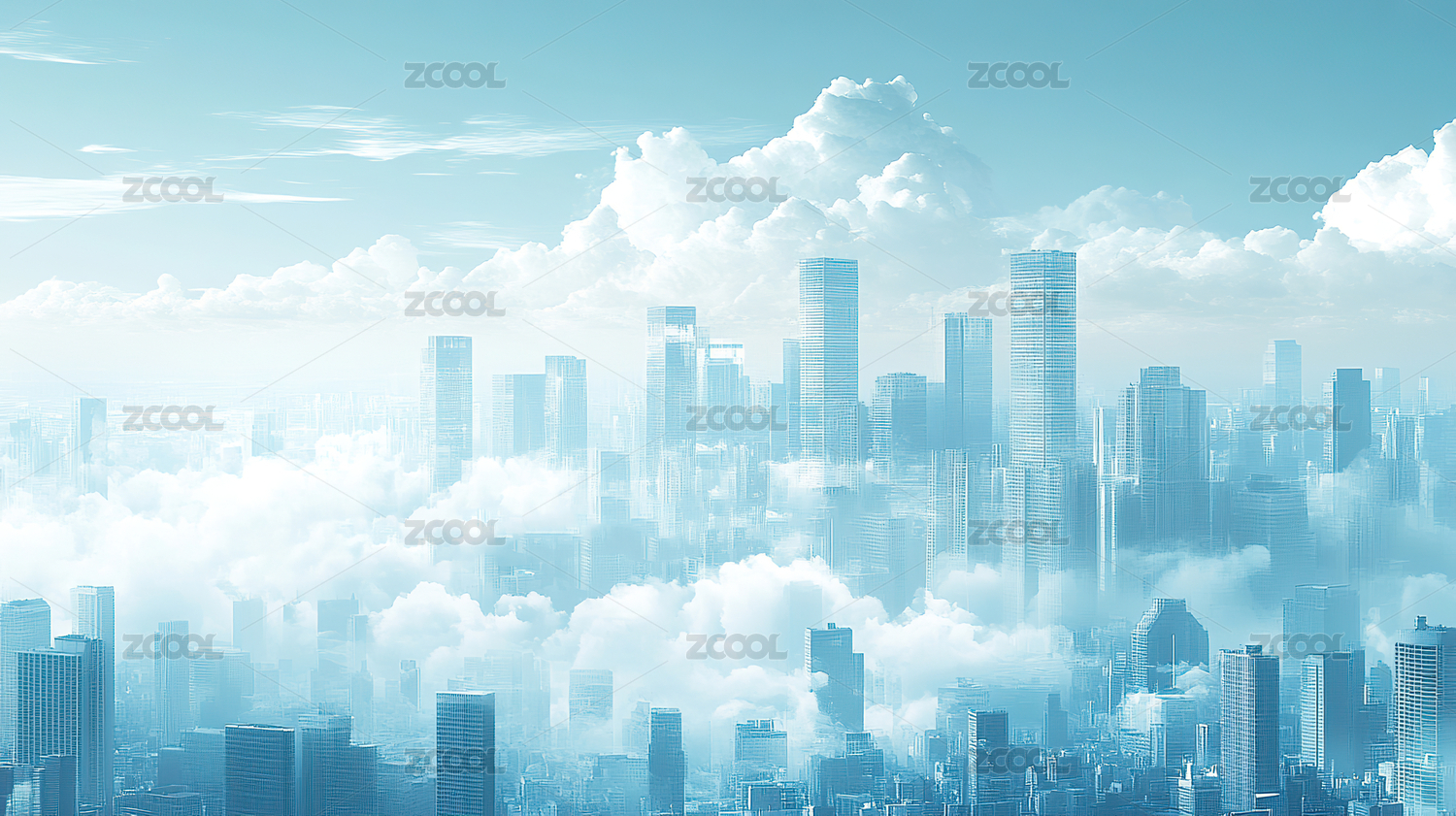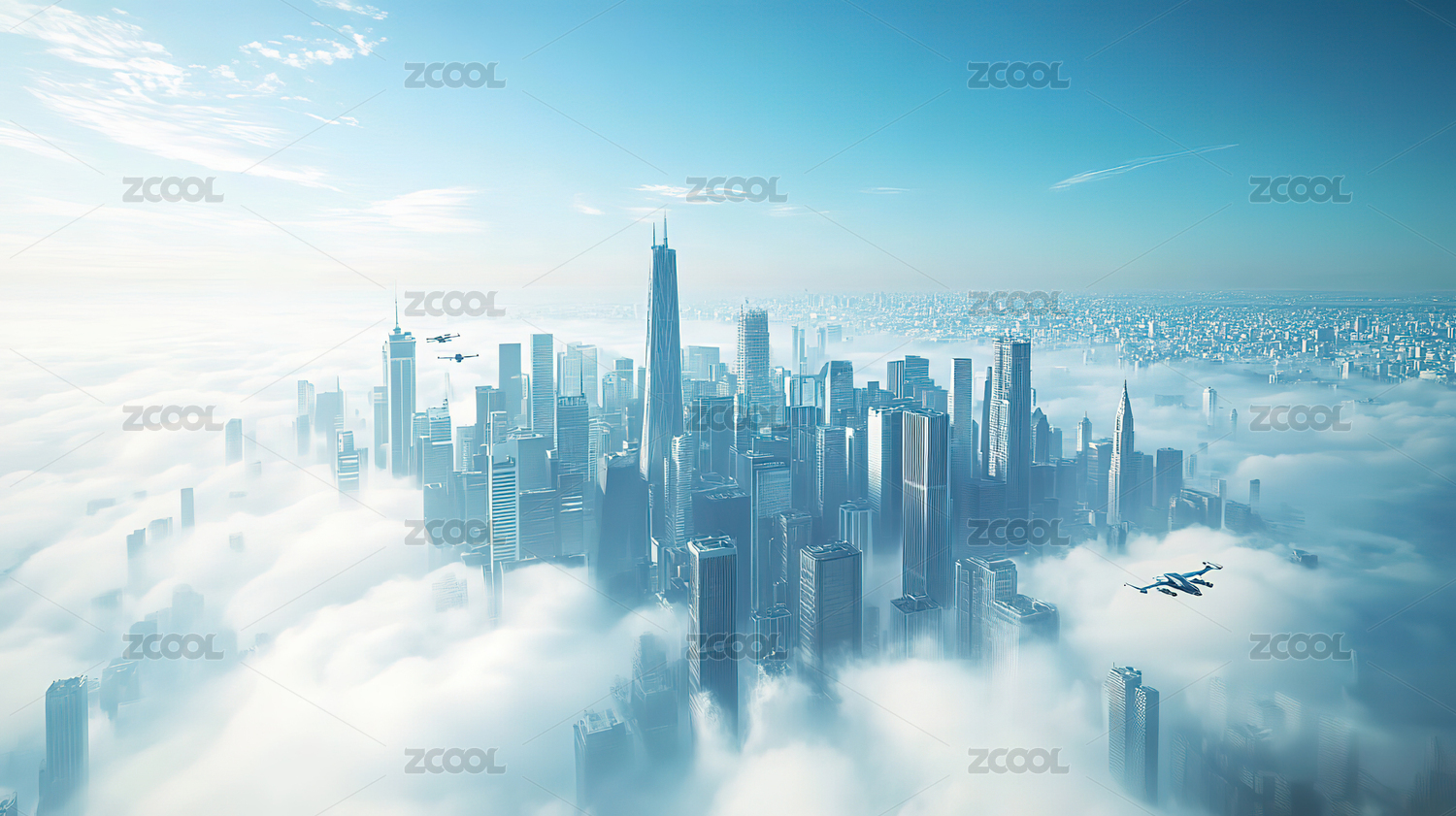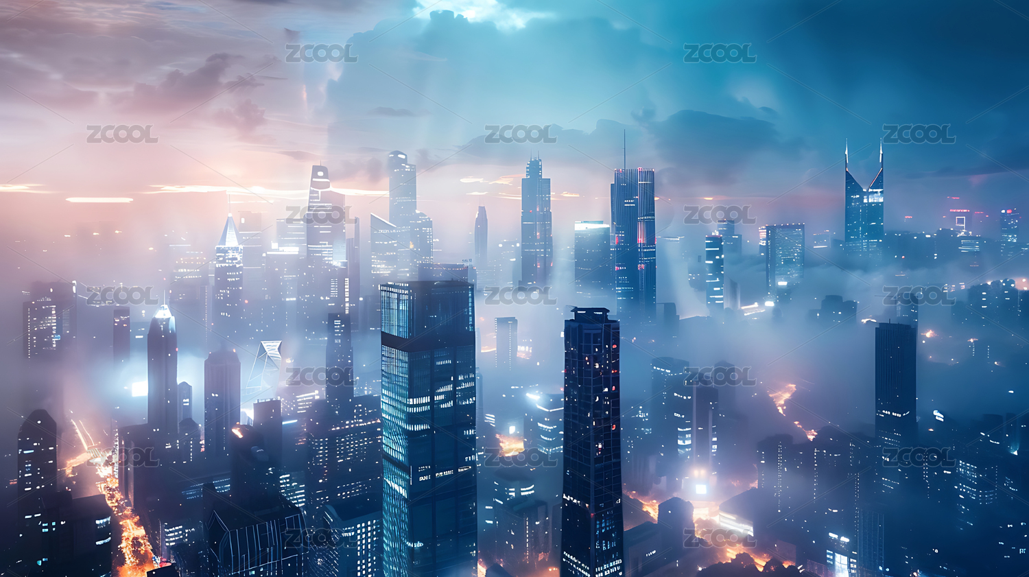 薄雾中阳光洒在摩天高楼上的城市早晨