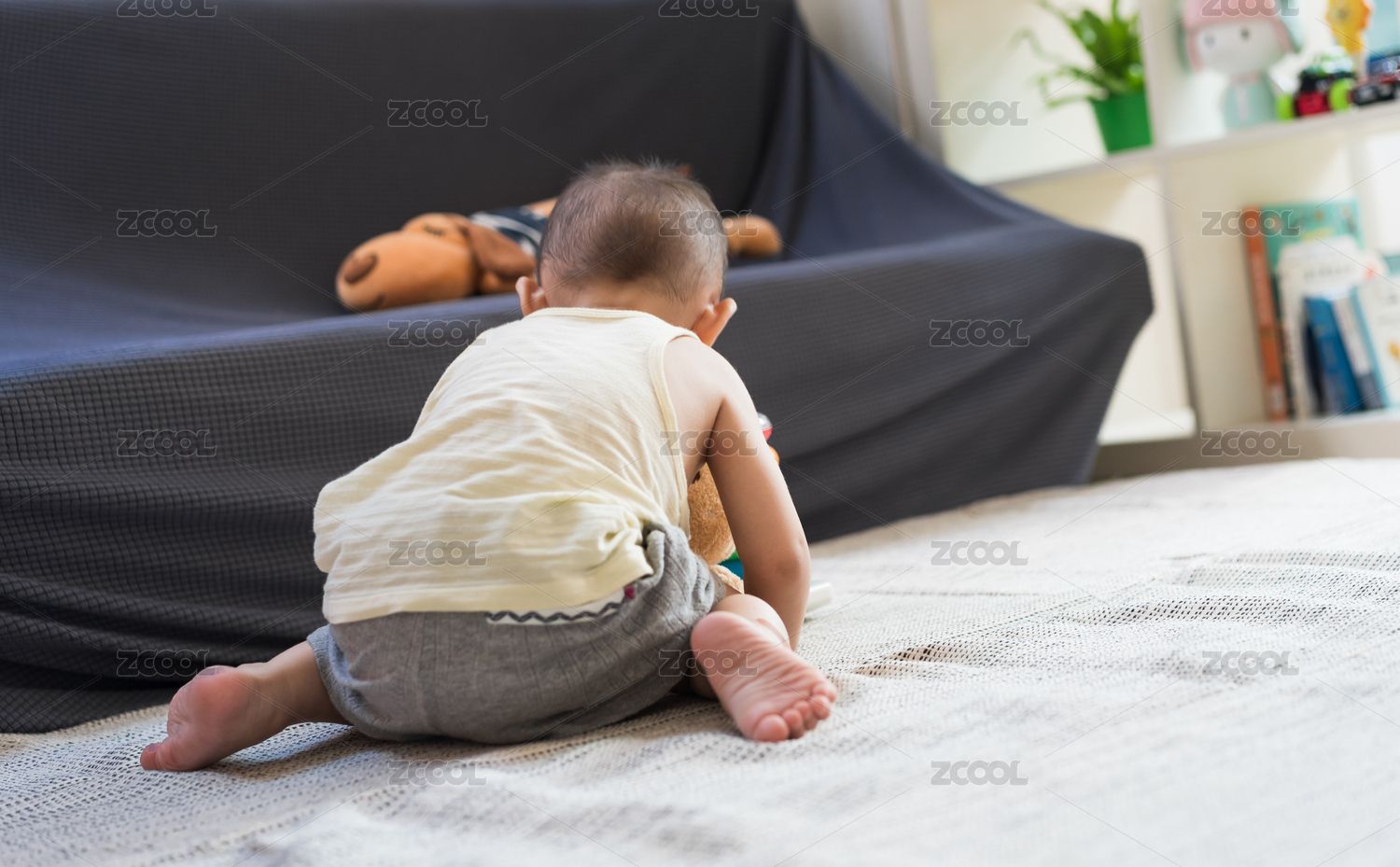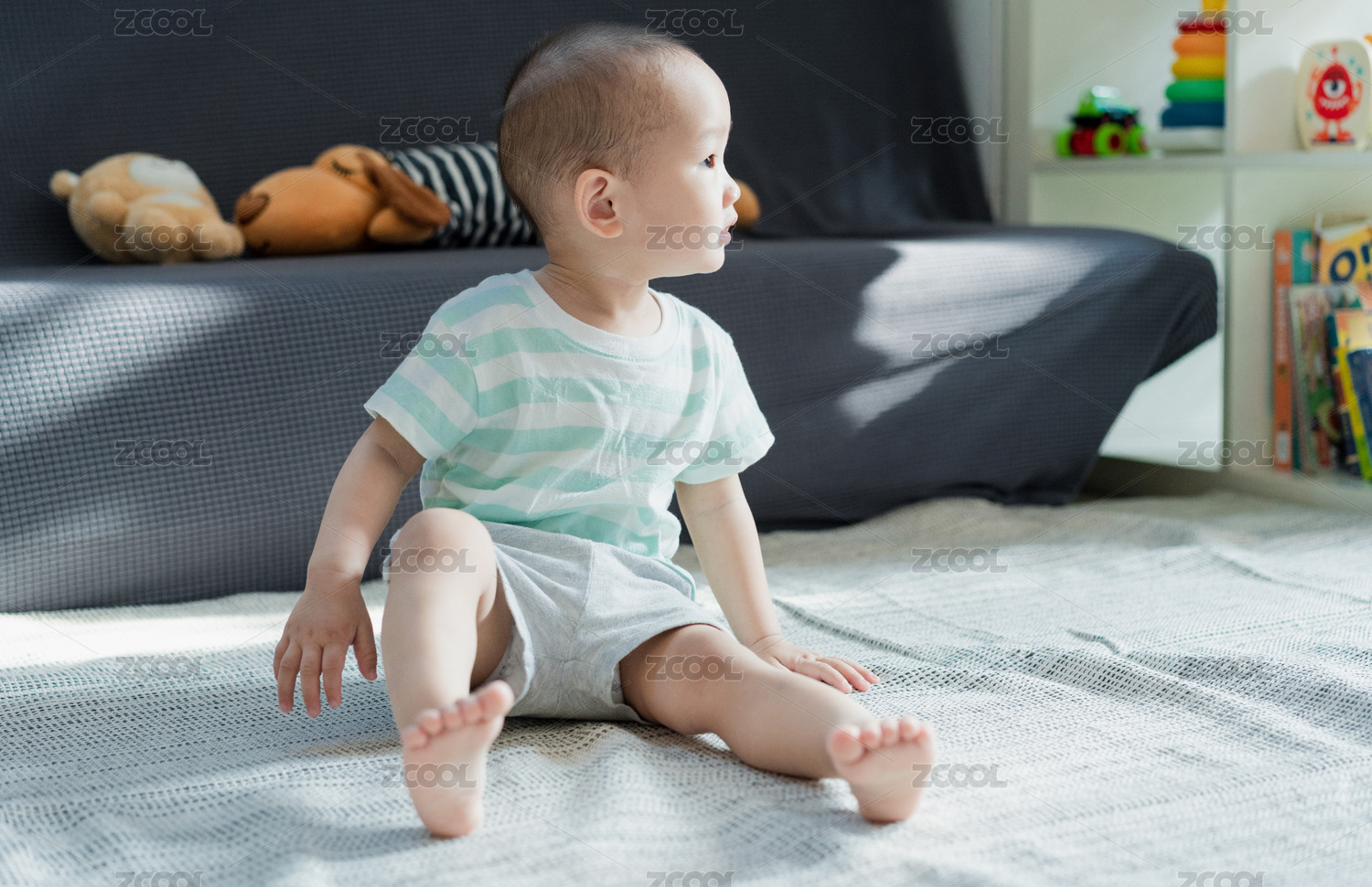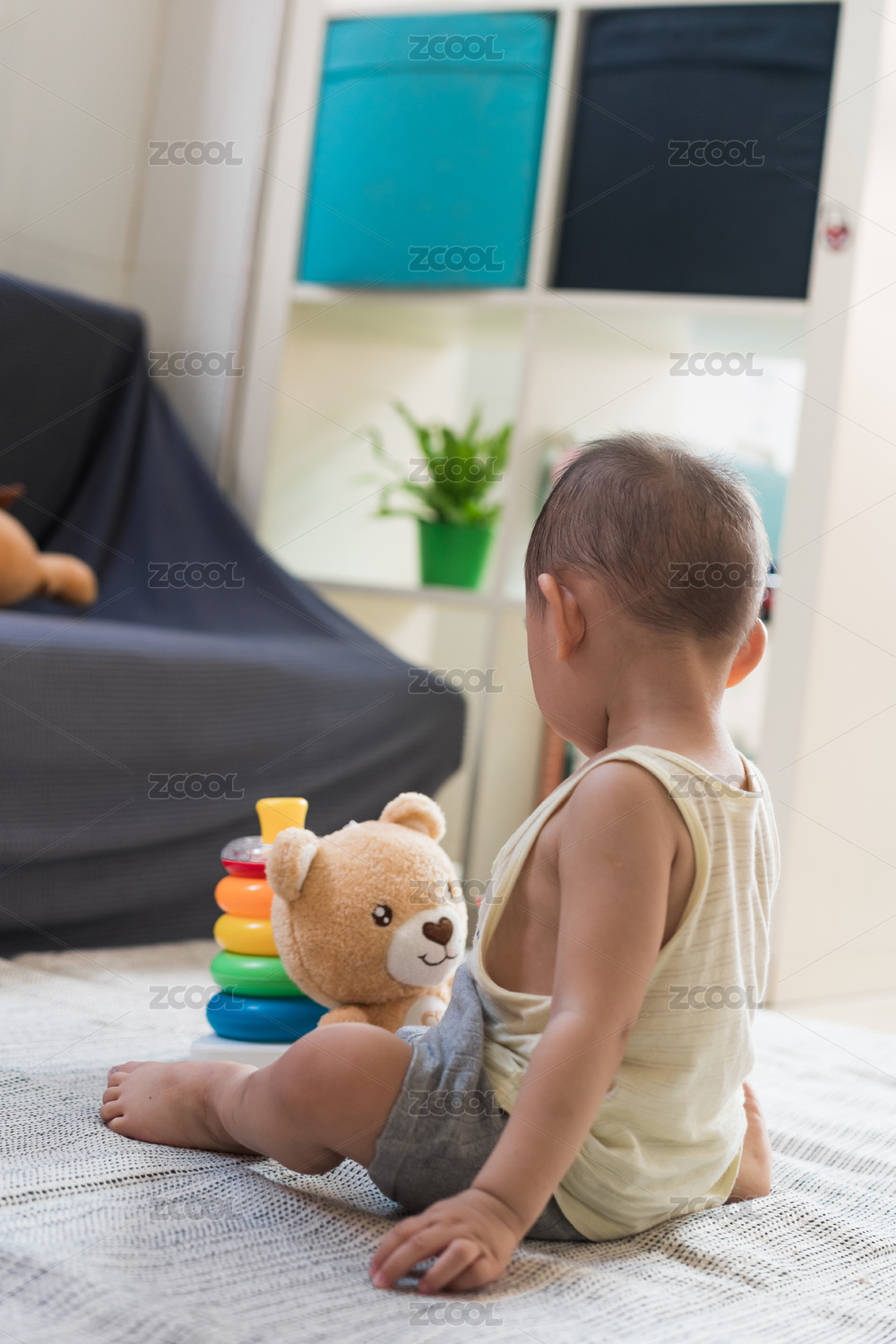 一岁半的男婴儿在地毯上玩耍益智玩具