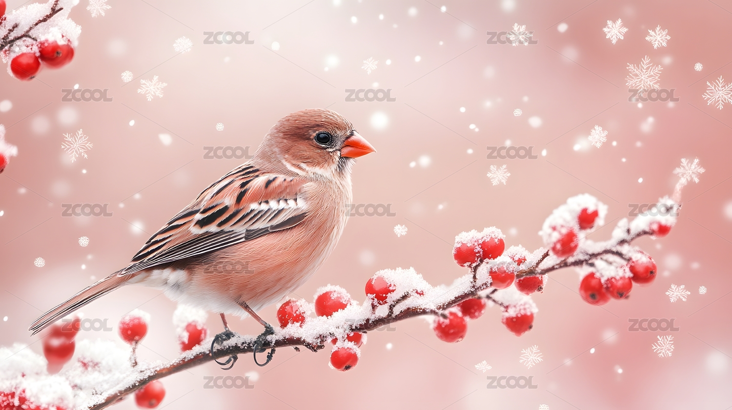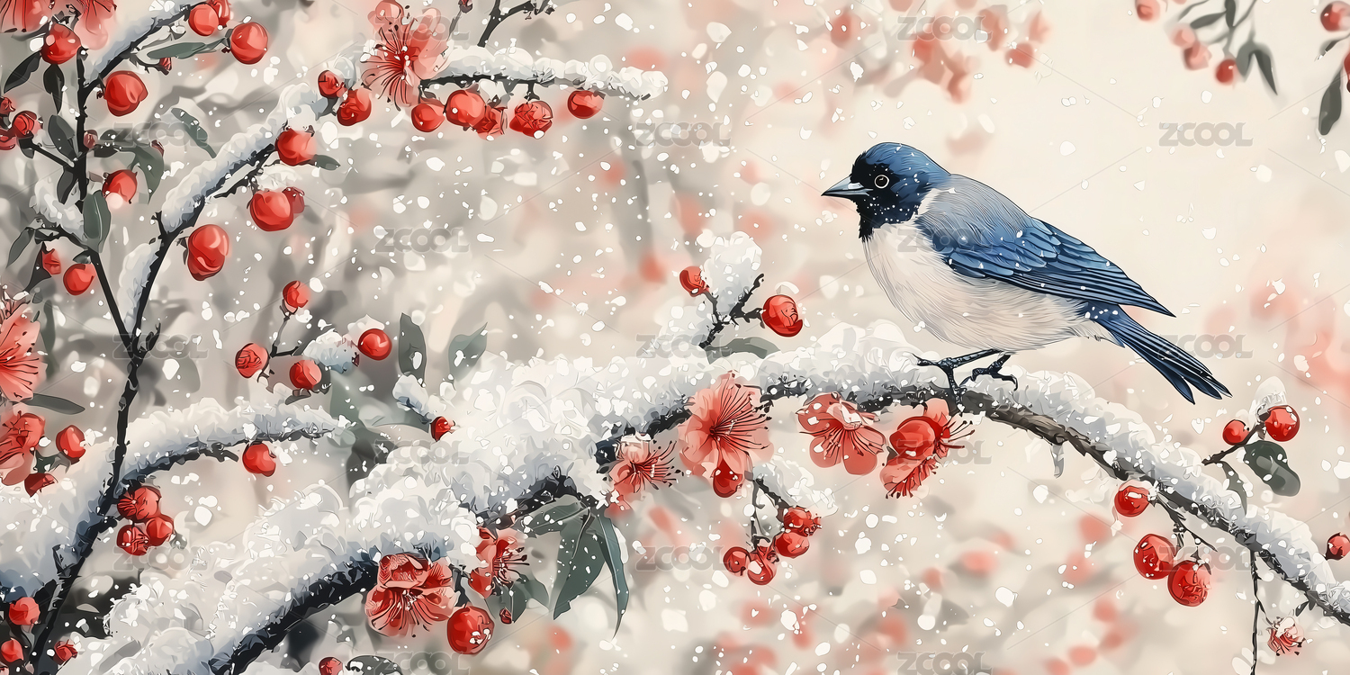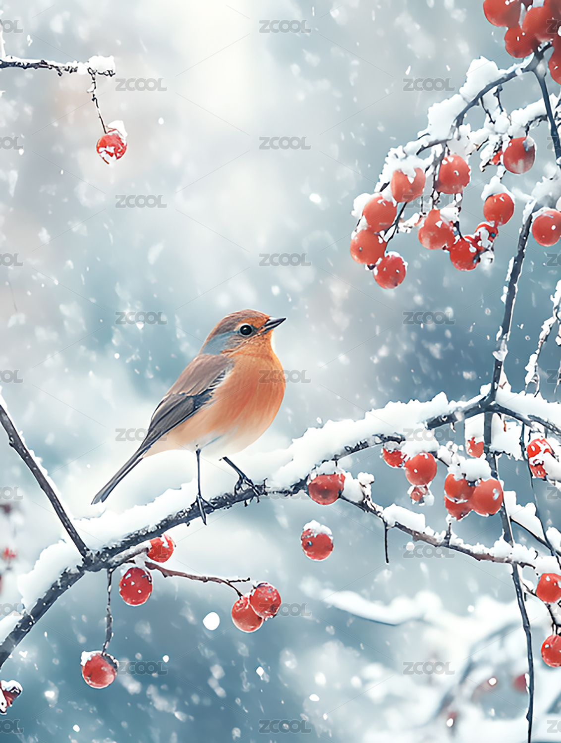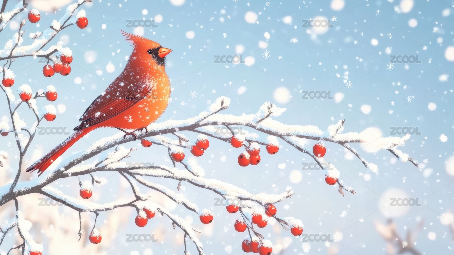 水彩风格下雪的冬天小鸟站在节满果实树枝上