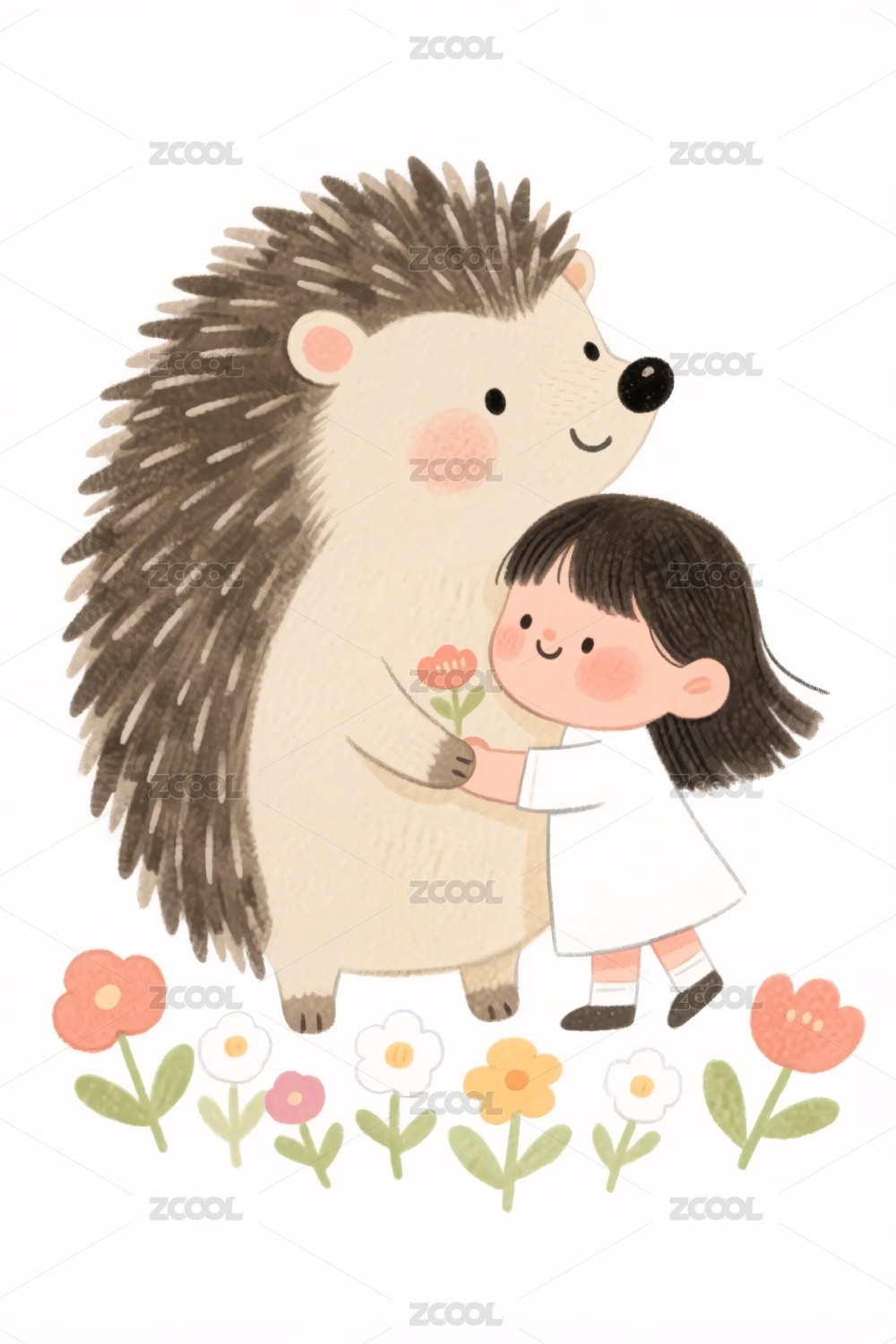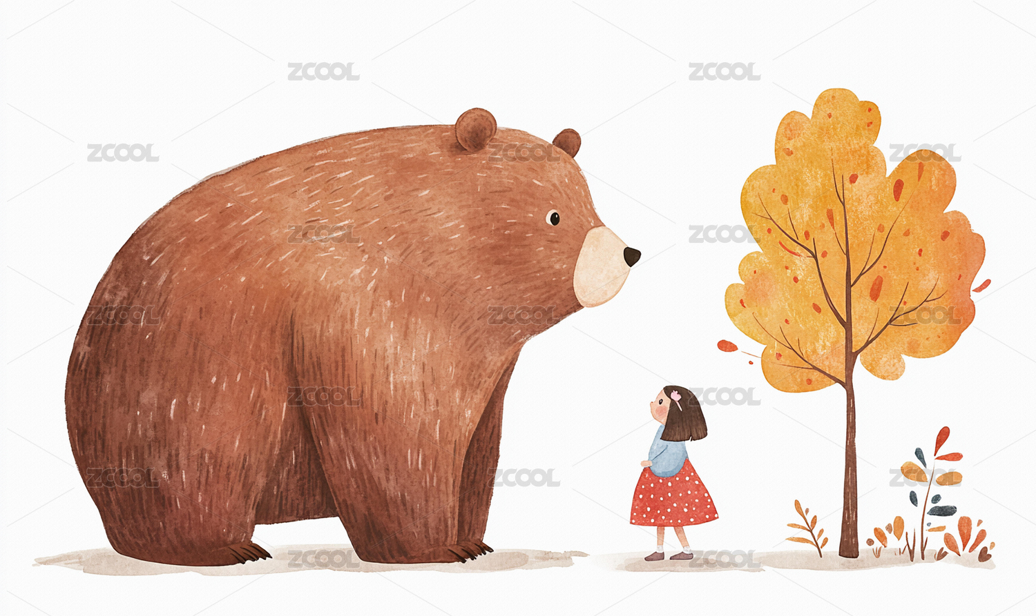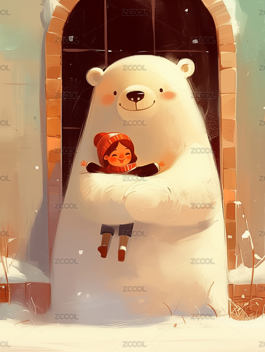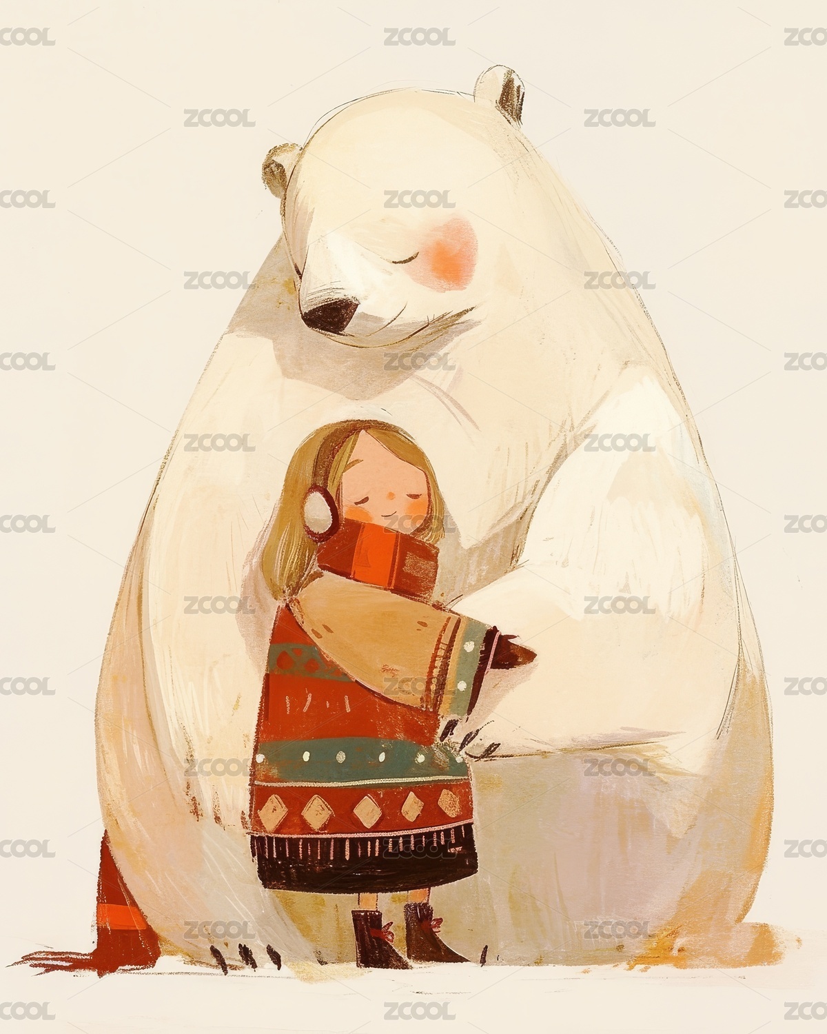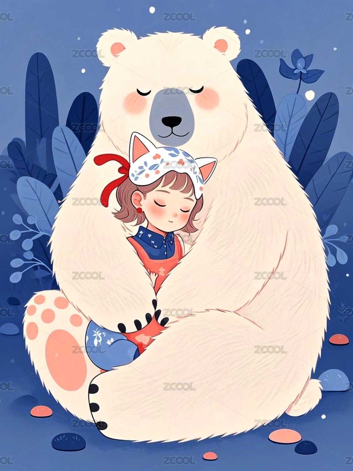 插画女孩和白熊拥抱夜晚温馨手绘场景