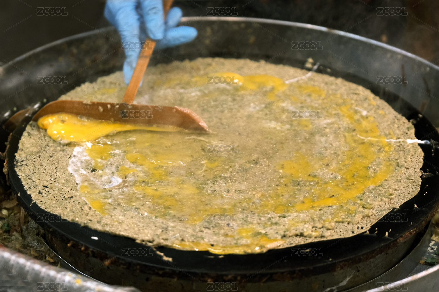 燃气灶上有一口冒着热气的油锅炸着烤串