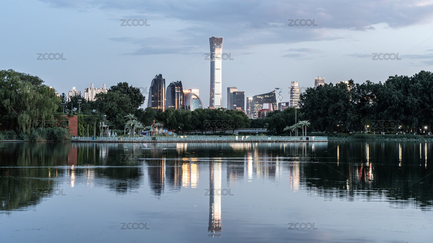 中国北京夜晚cbd建筑群灯光湖面倒影