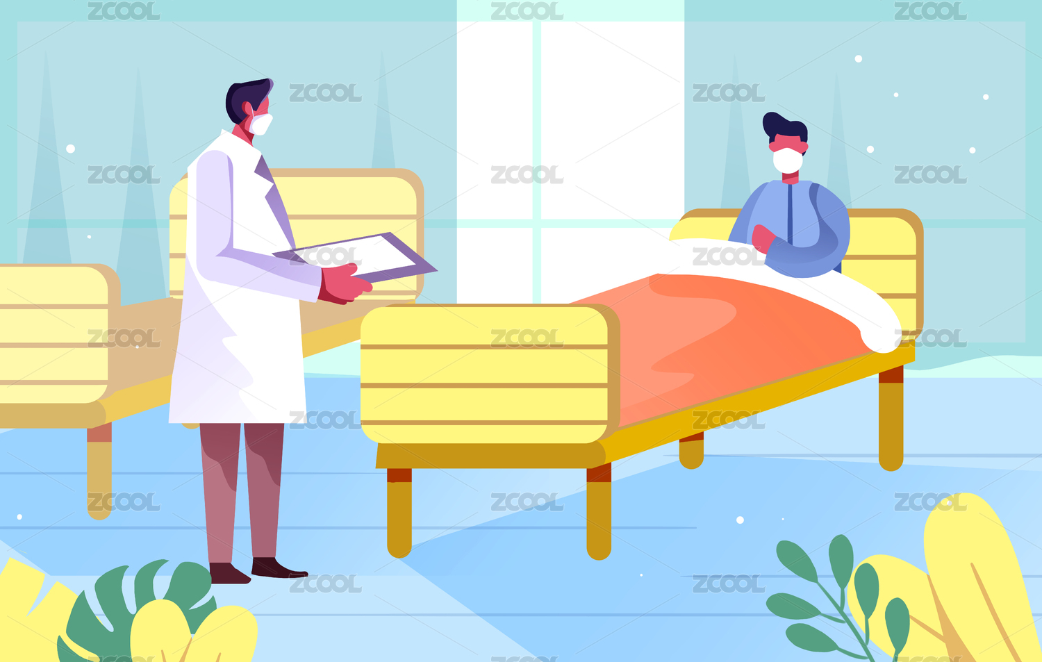 卡通戴口罩医生检查病人情况插画