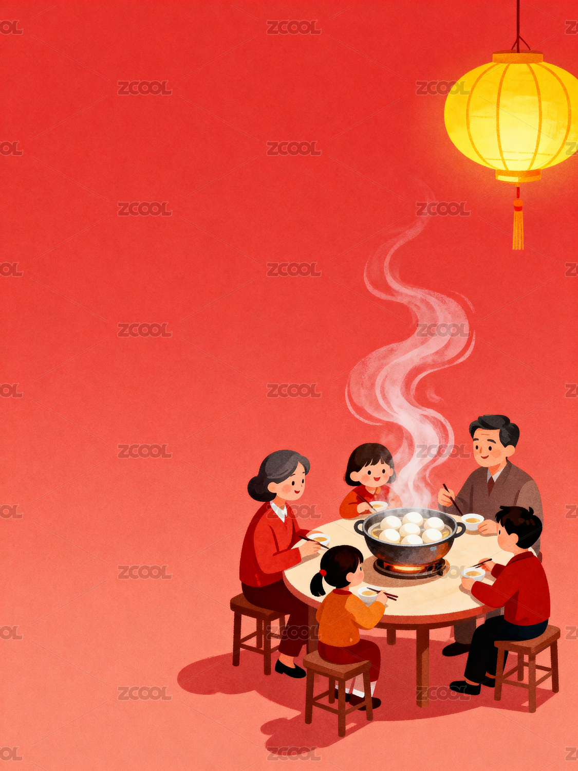 手绘中国风新年吃团圆饭的一家人竖版夜景