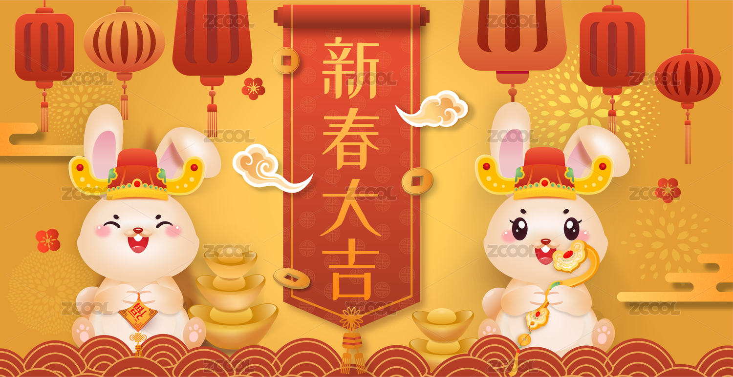 兔年春节财源广进招财进宝横幅矢量插画海报