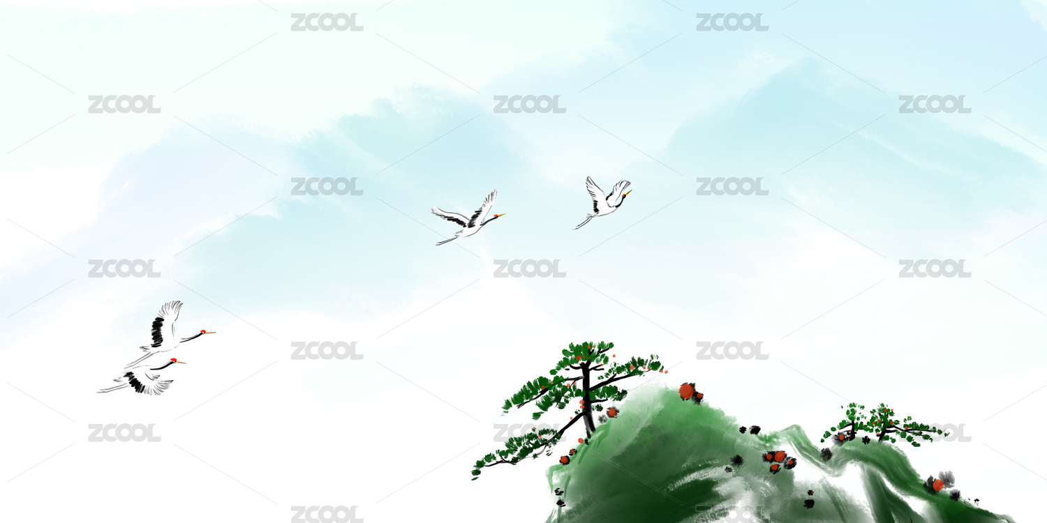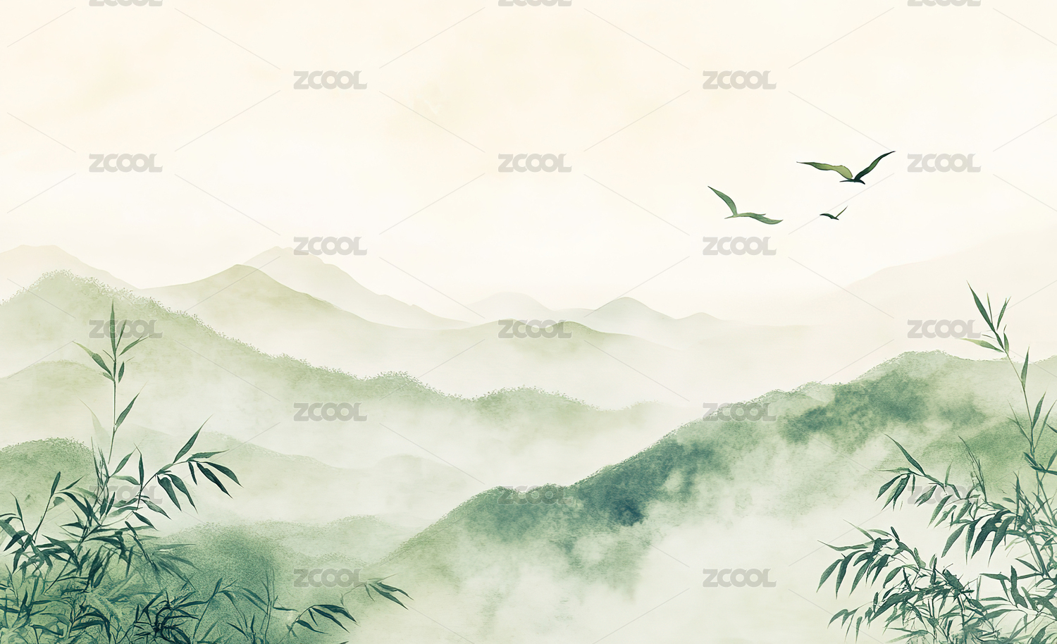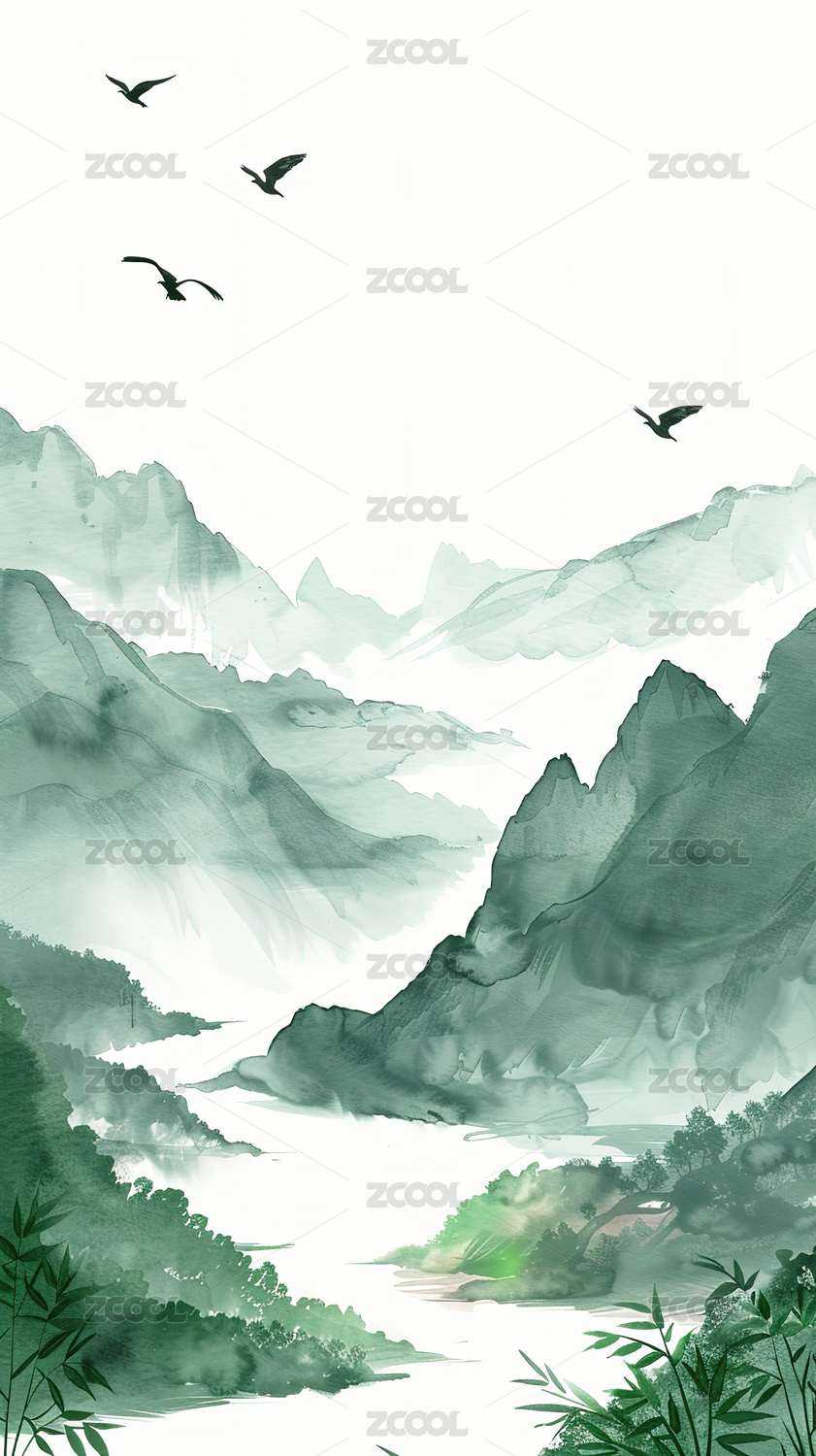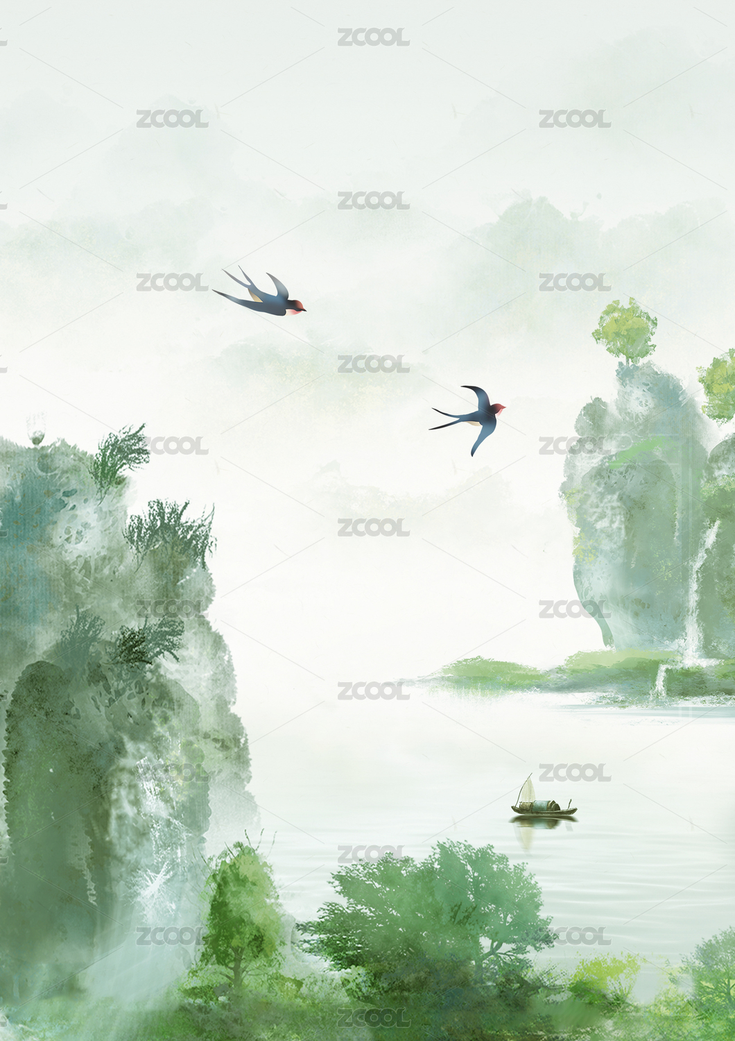 手绘小清新春夏节气水彩场景芦苇远山帆船