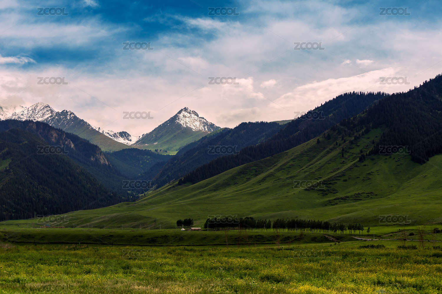 中国新疆伊犁那拉提的雪山草地森林与牧场