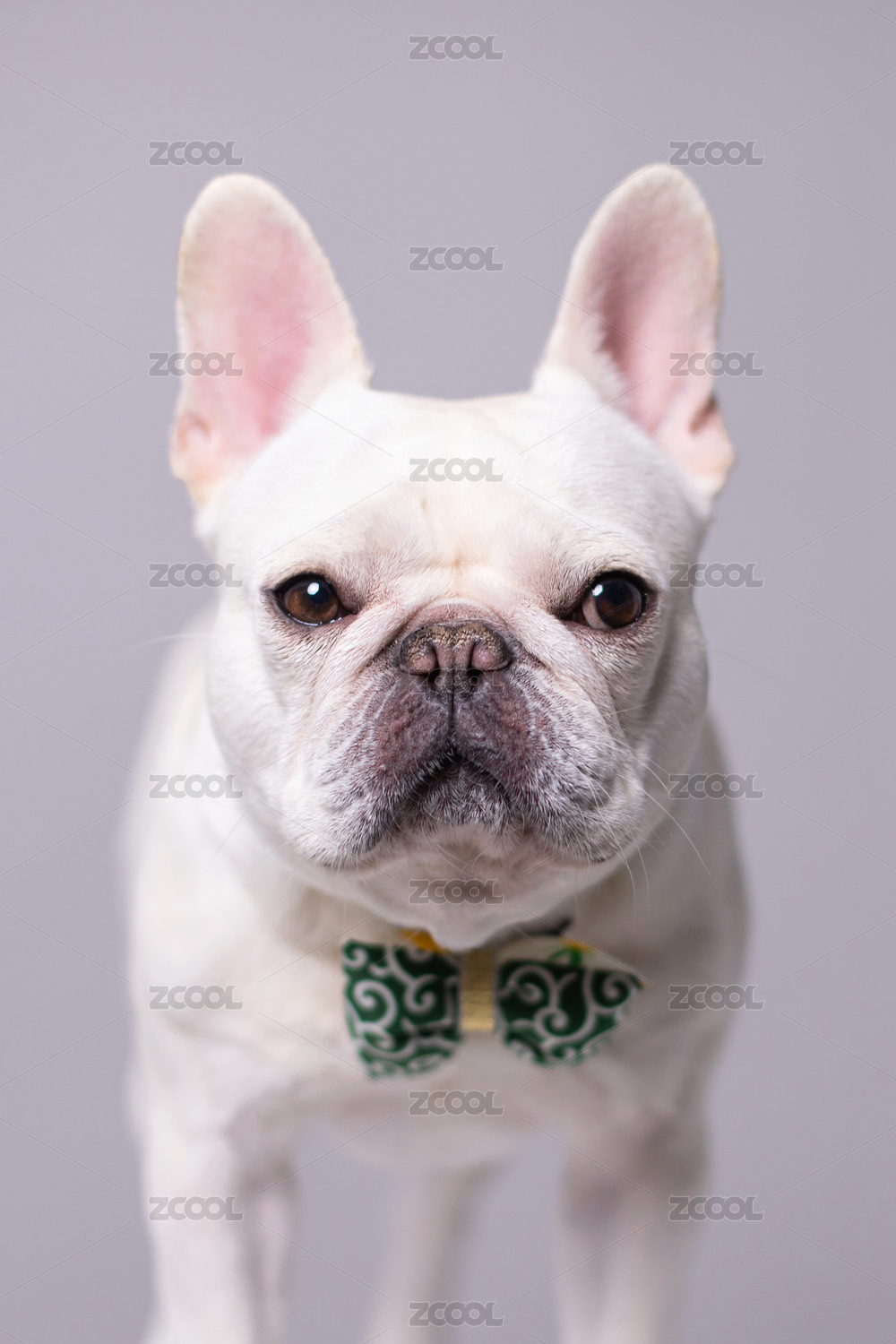 一只底着头不开心的奶白色法国斗牛犬坐在白色背景前拍宠物写真