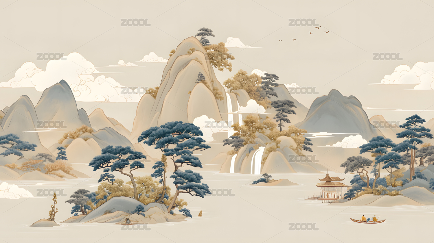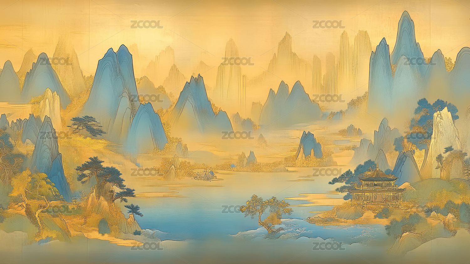 古风山水画,千里江山图,山水,山水画,水墨山水画,新中式山水,新中式山水画,AIGC,高山,自然