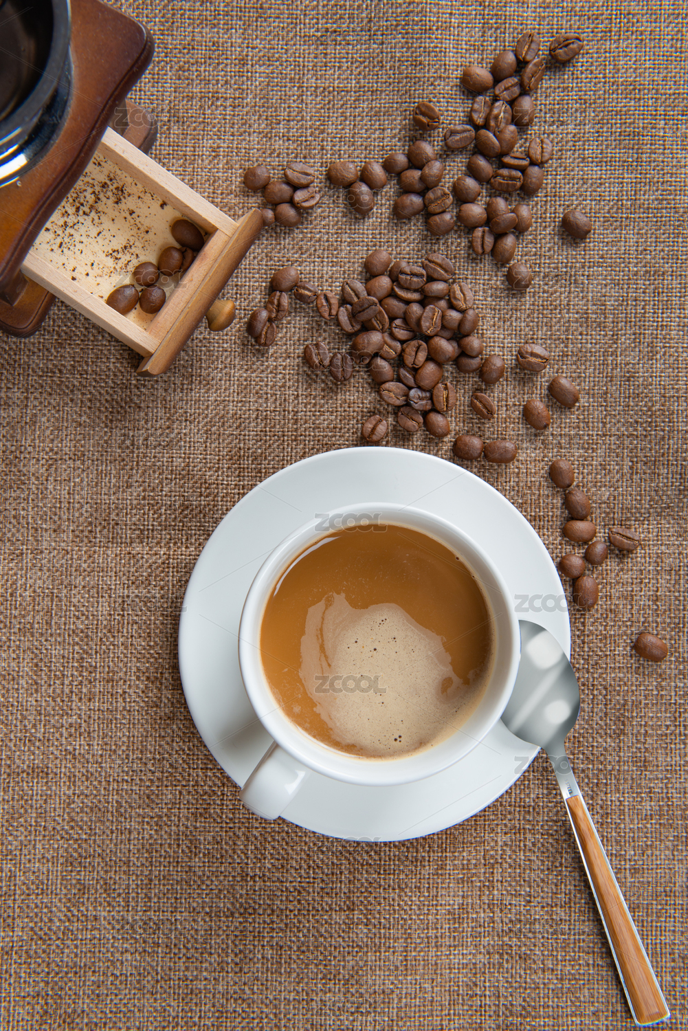 装着咖啡的精致瓷杯和一些散落着的咖啡豆放