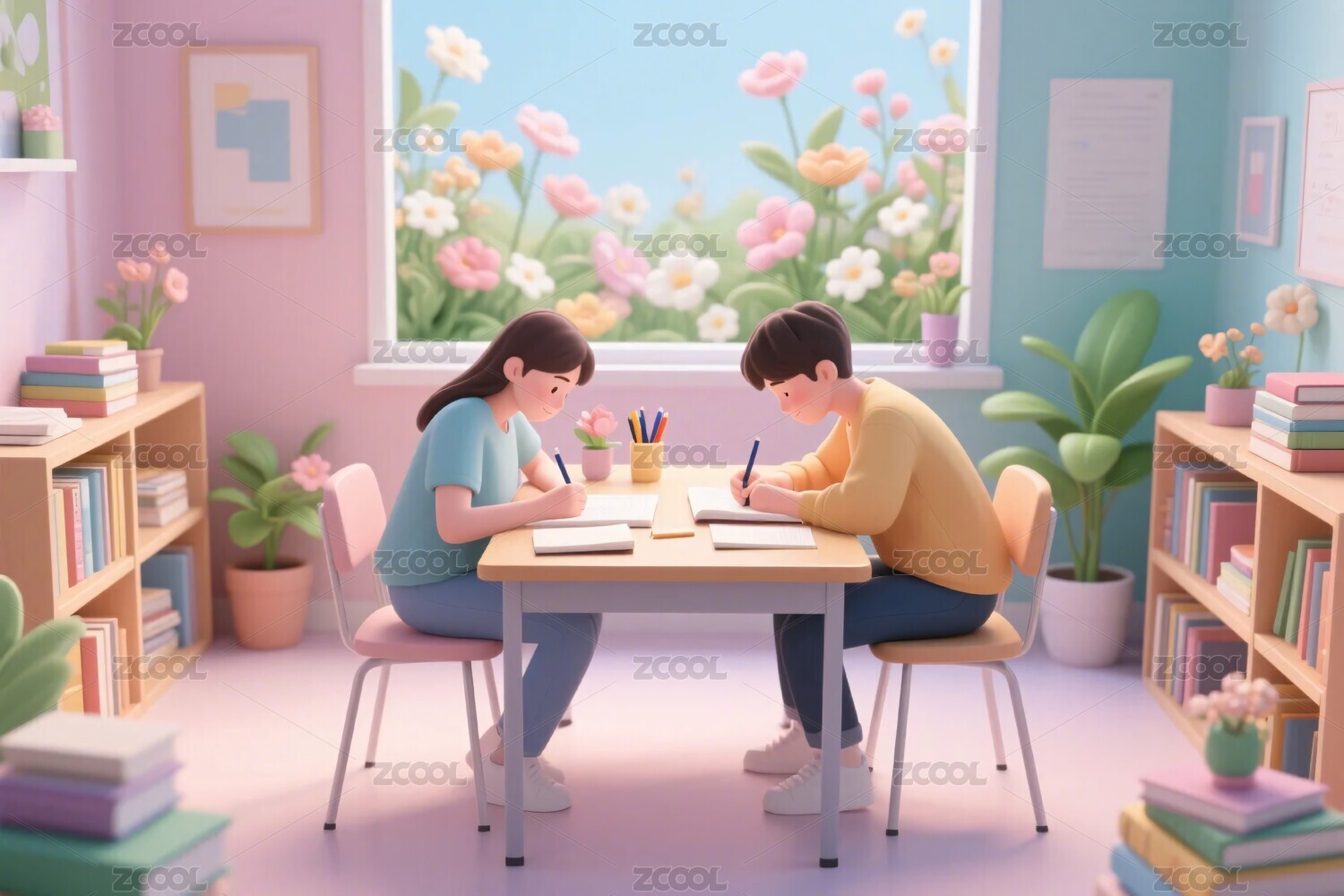 高中生男女坐在书本上蓝天白云纸张3D插画