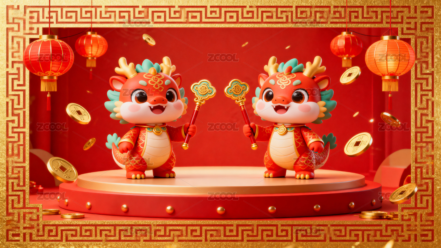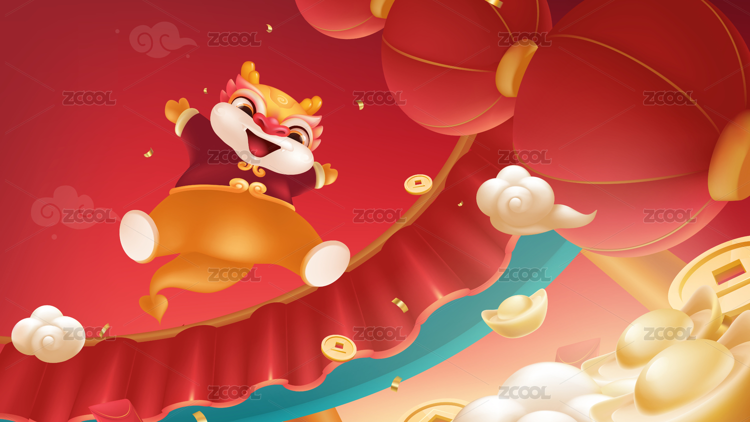 元宵节背景设计可爱的龙全家正在逛元宵灯会
