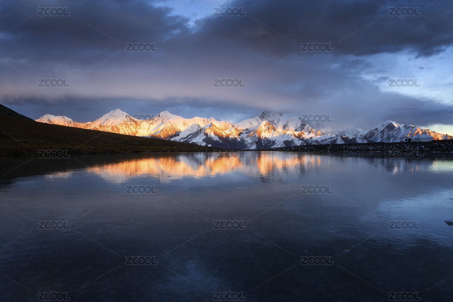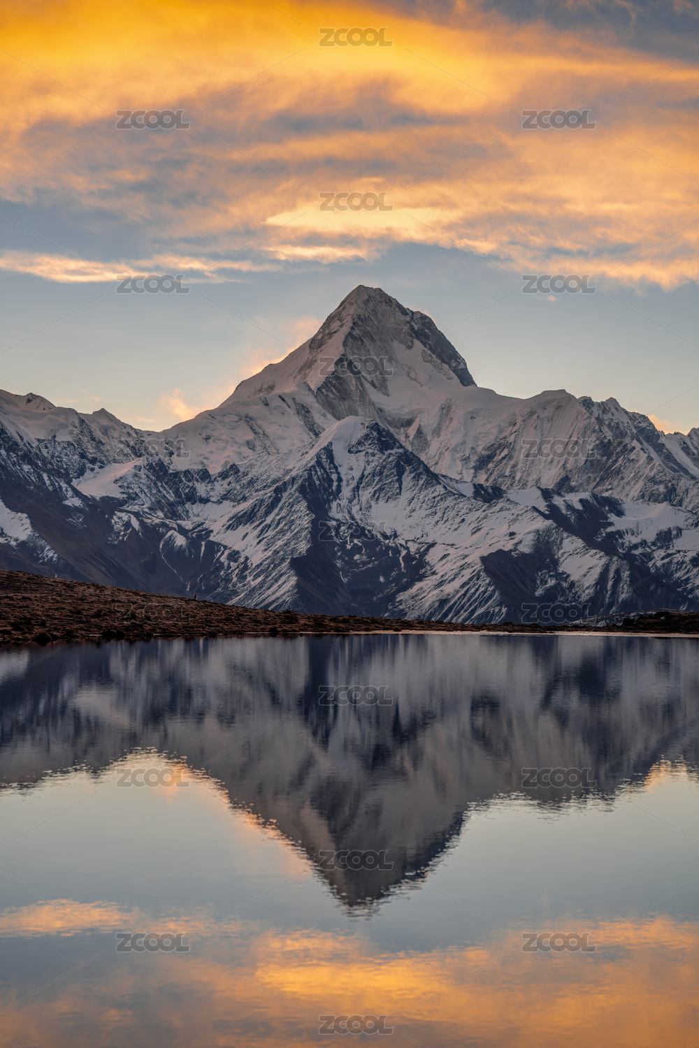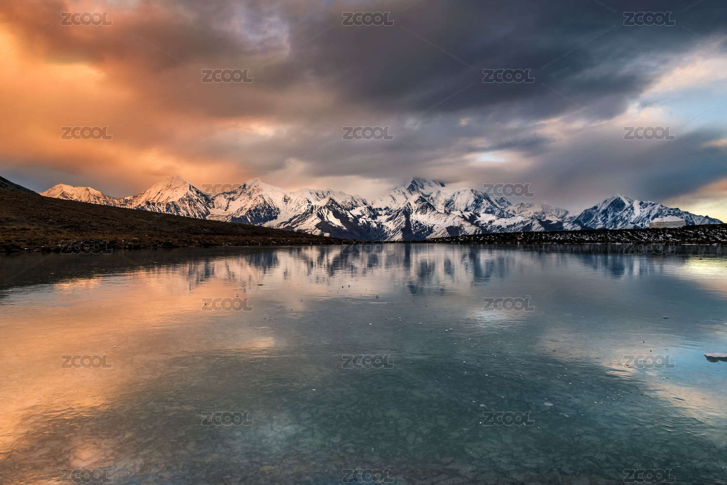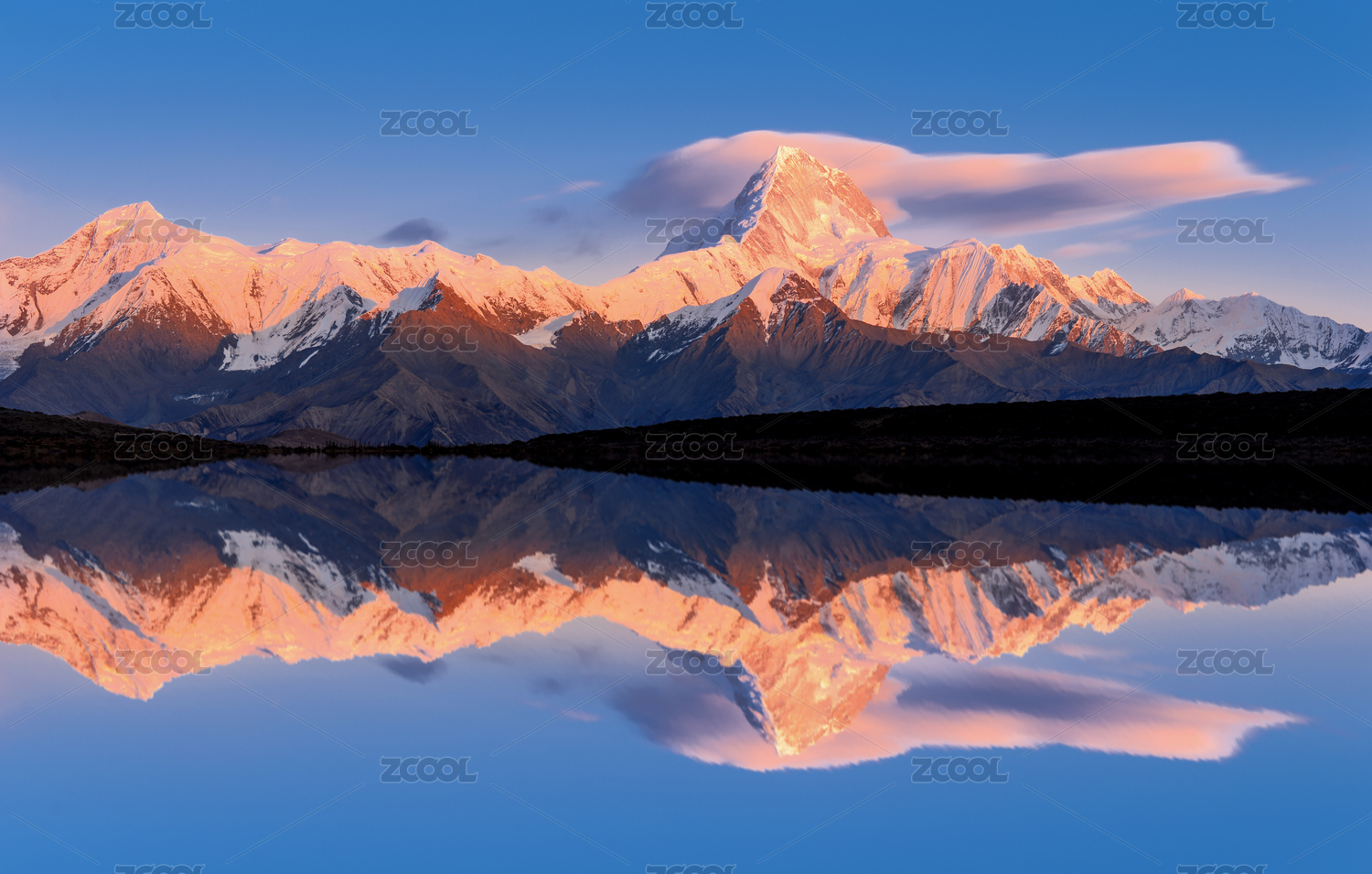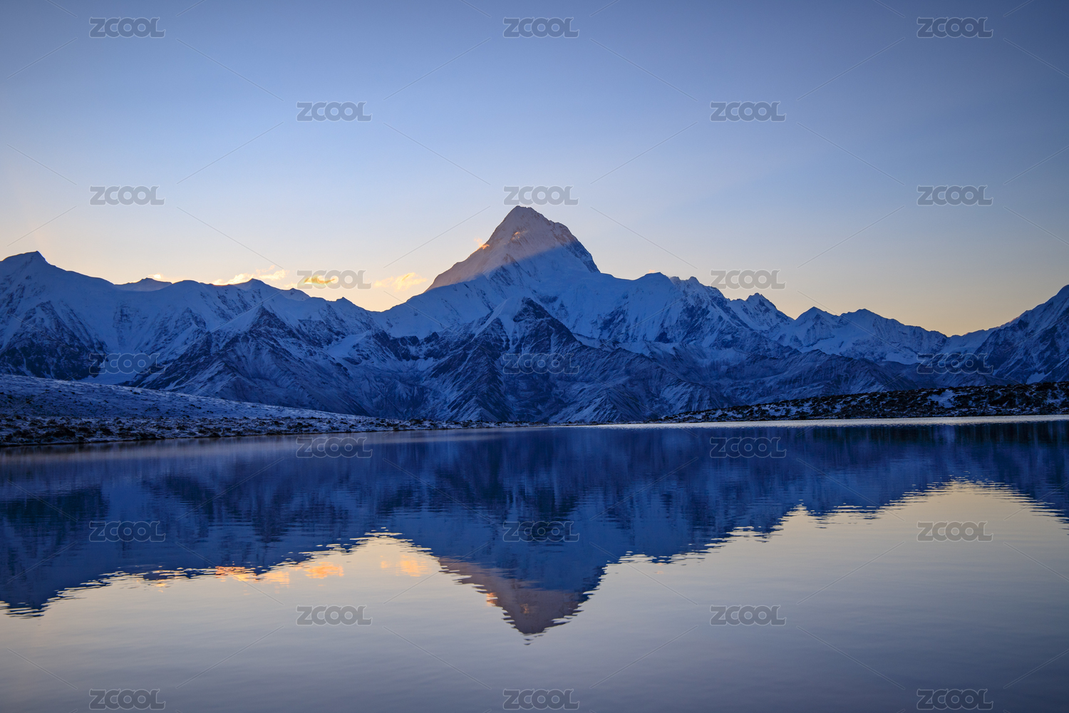 四川甘孜州高原冷嘎措贡嘎雪山倒影映照冰湖