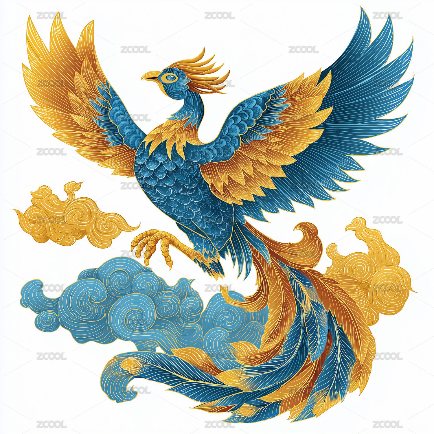 彩色国风凤凰插画祥云环绕展翅姿态的艺术作