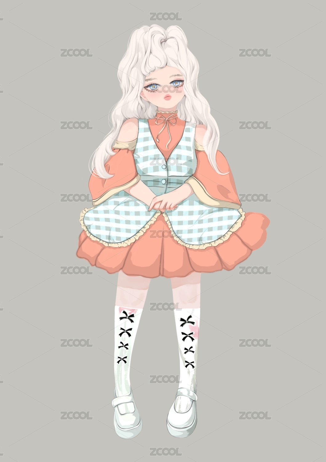 穿连衣裙的插画女孩格子马甲米色卷发可爱