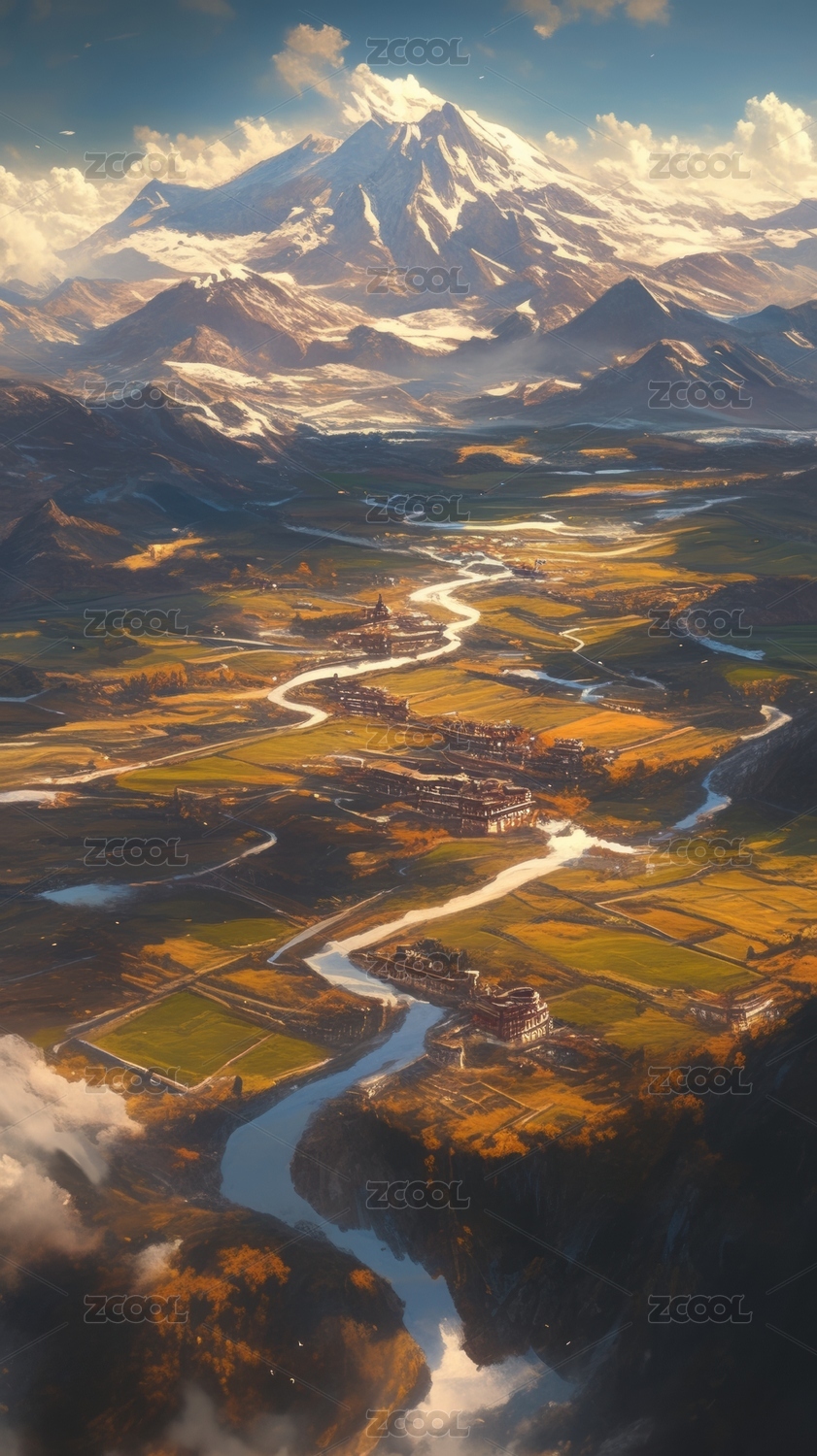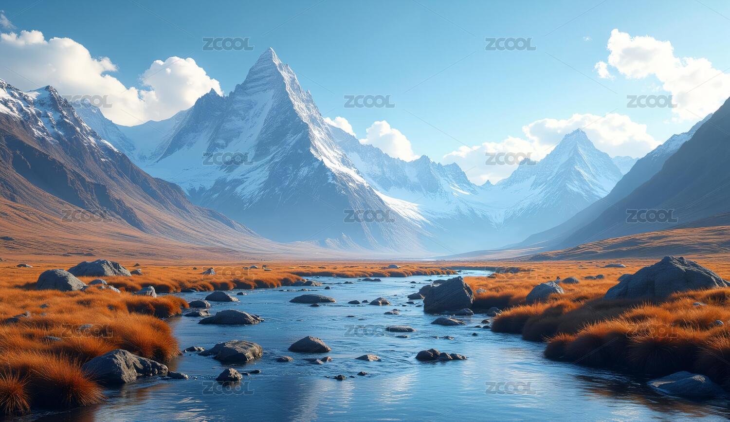 唯美的雪山枯萎的草地冰川溪流风景油画