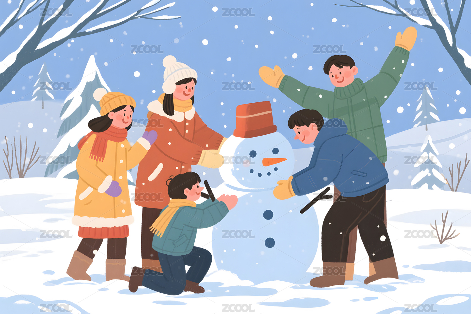小寒大寒节气冬季一家人户外活动堆雪人插画