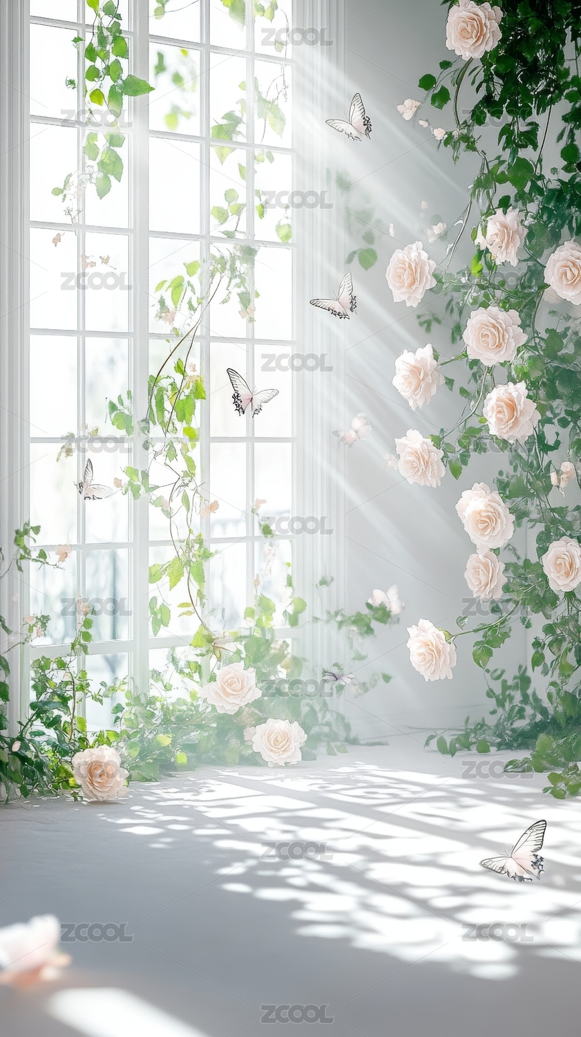 别墅窗边盛开着浪漫唯美的玫瑰花背景墙