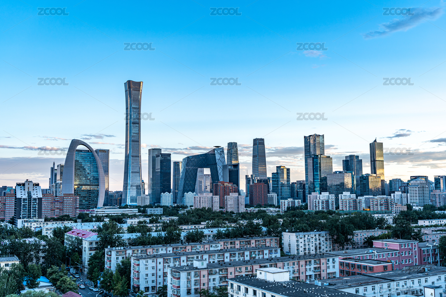 中国北京CBD建筑群高视角黄昏风光