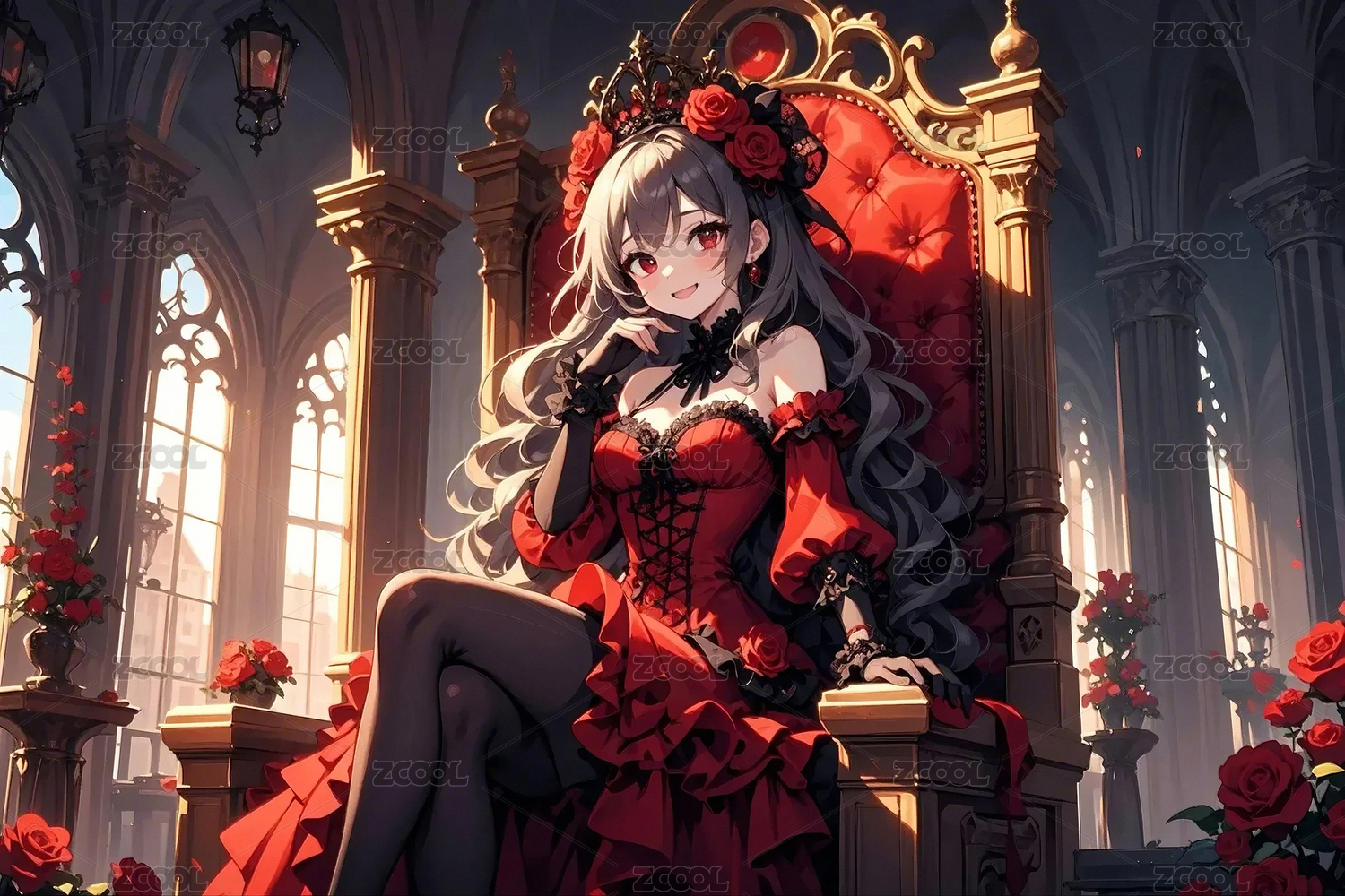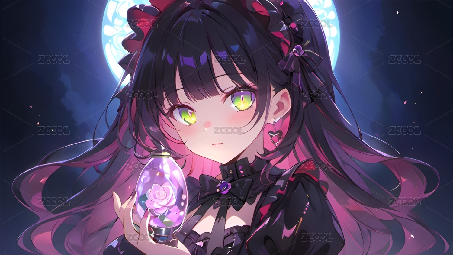粉发女巫持粉杖黑裙巫师帽华丽场景