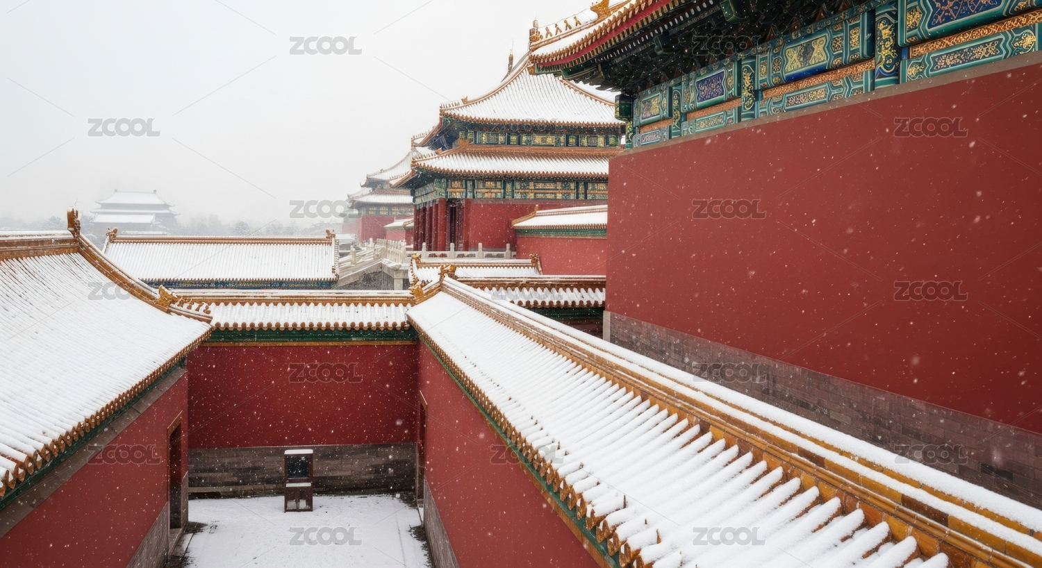 中国宫殿古建群鸟瞰图,故宫雪景金顶红墙,