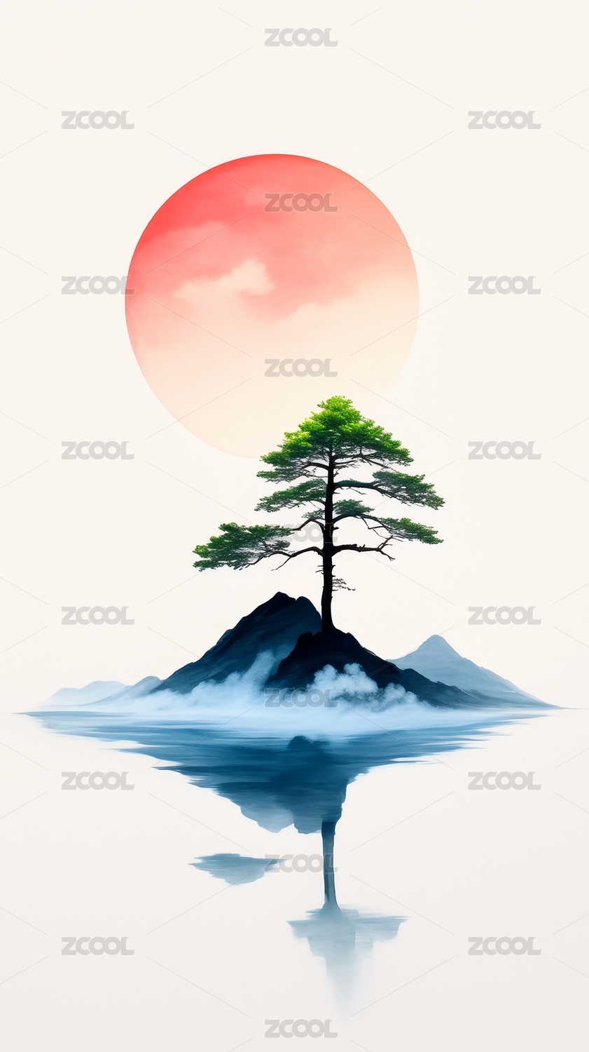 孤山松树红日图