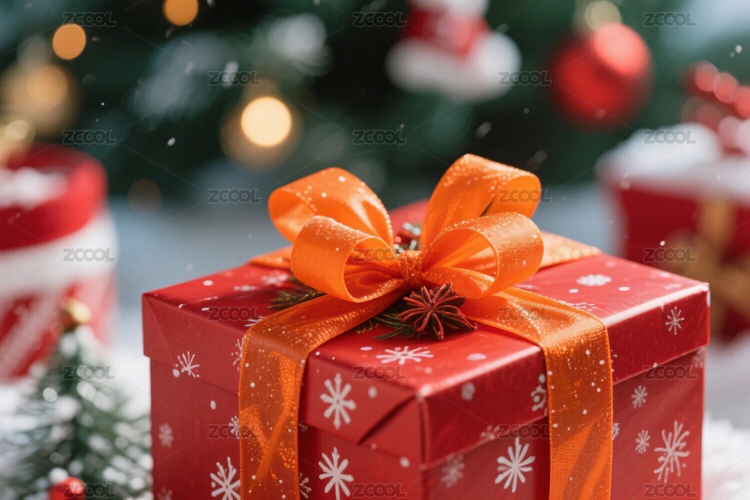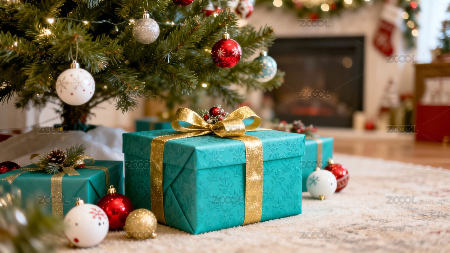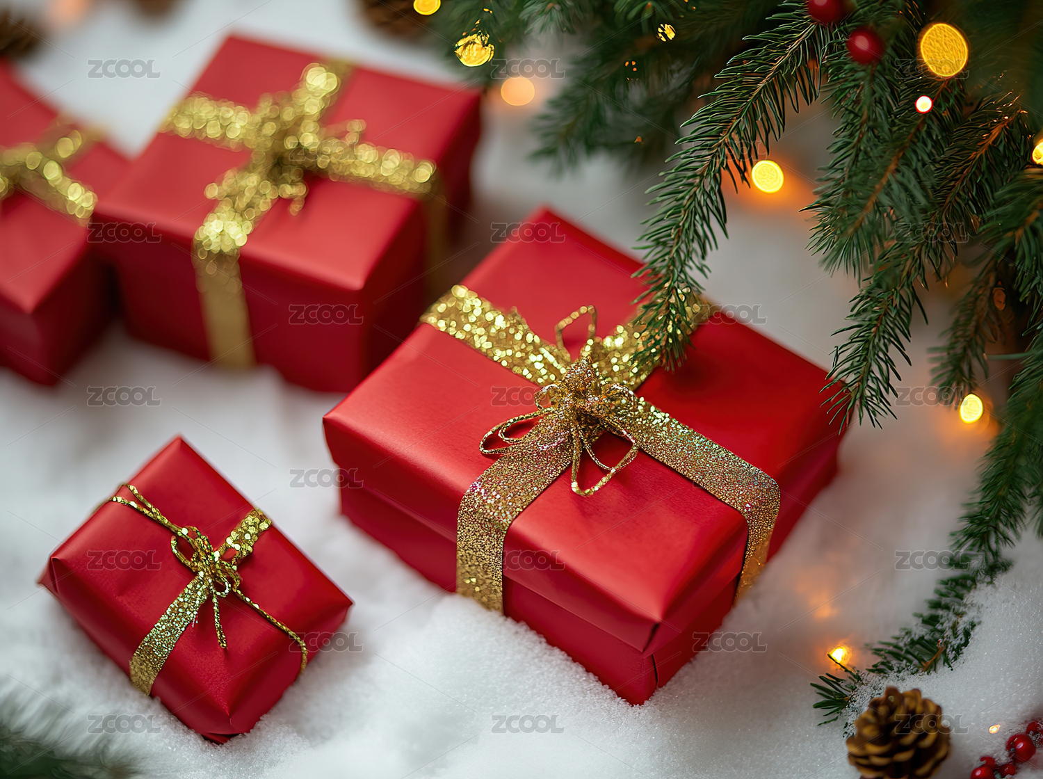 圣诞礼物,红白波浪形,蝴蝶结,圣诞花环,金色圣诞球,红色圣诞球,节日气氛,交换礼物,欢乐,分享精神