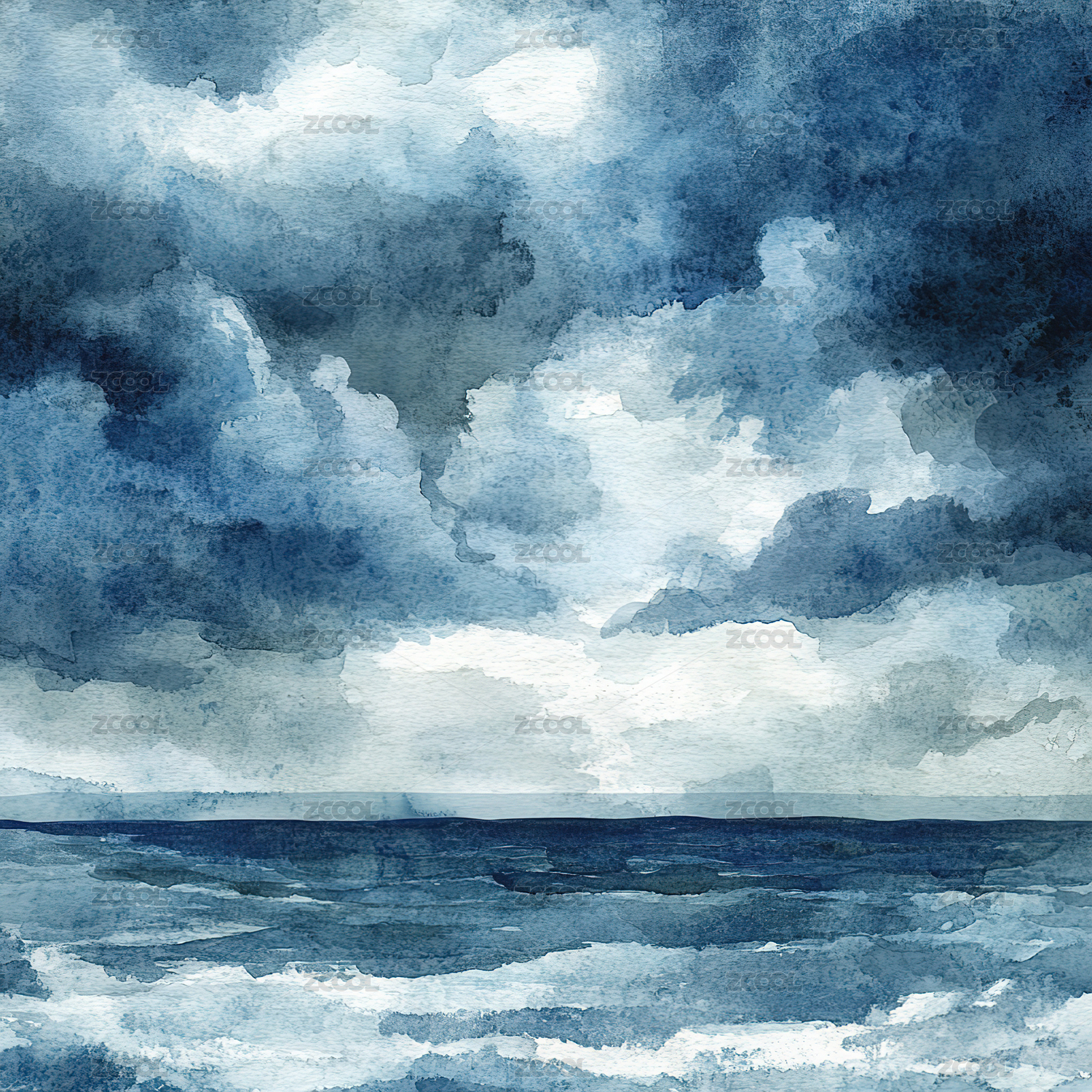 蓝天白云晴朗天气海边海浪沙滩水彩插画