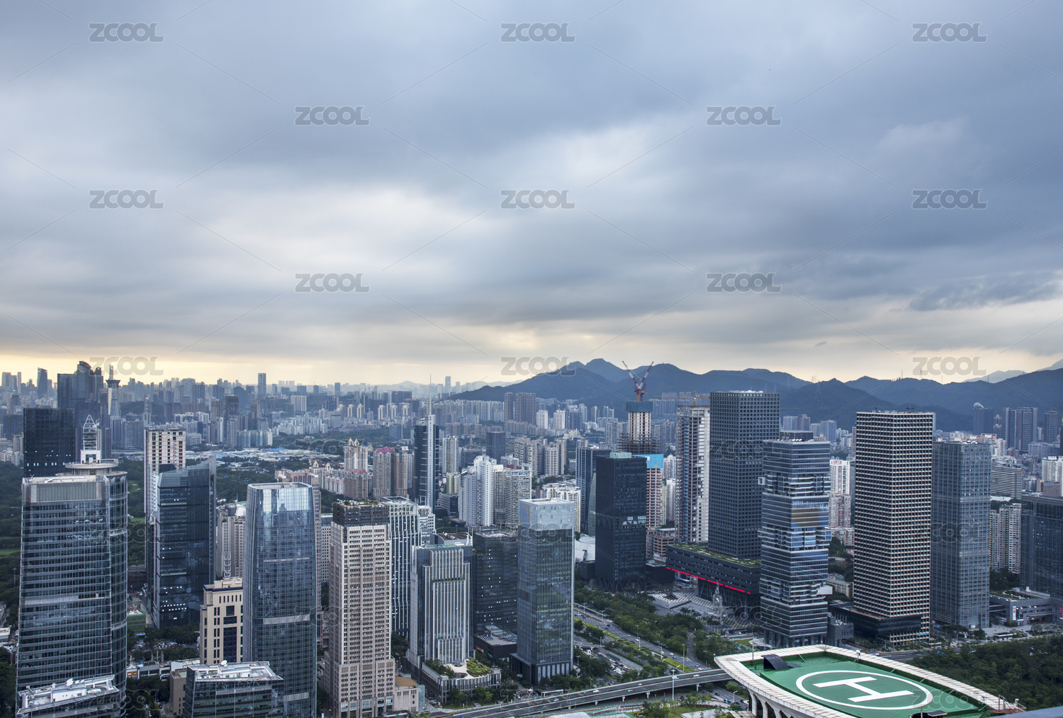 鸟瞰有云的中国深圳城市天际线建筑群高楼大厦傍晚风光