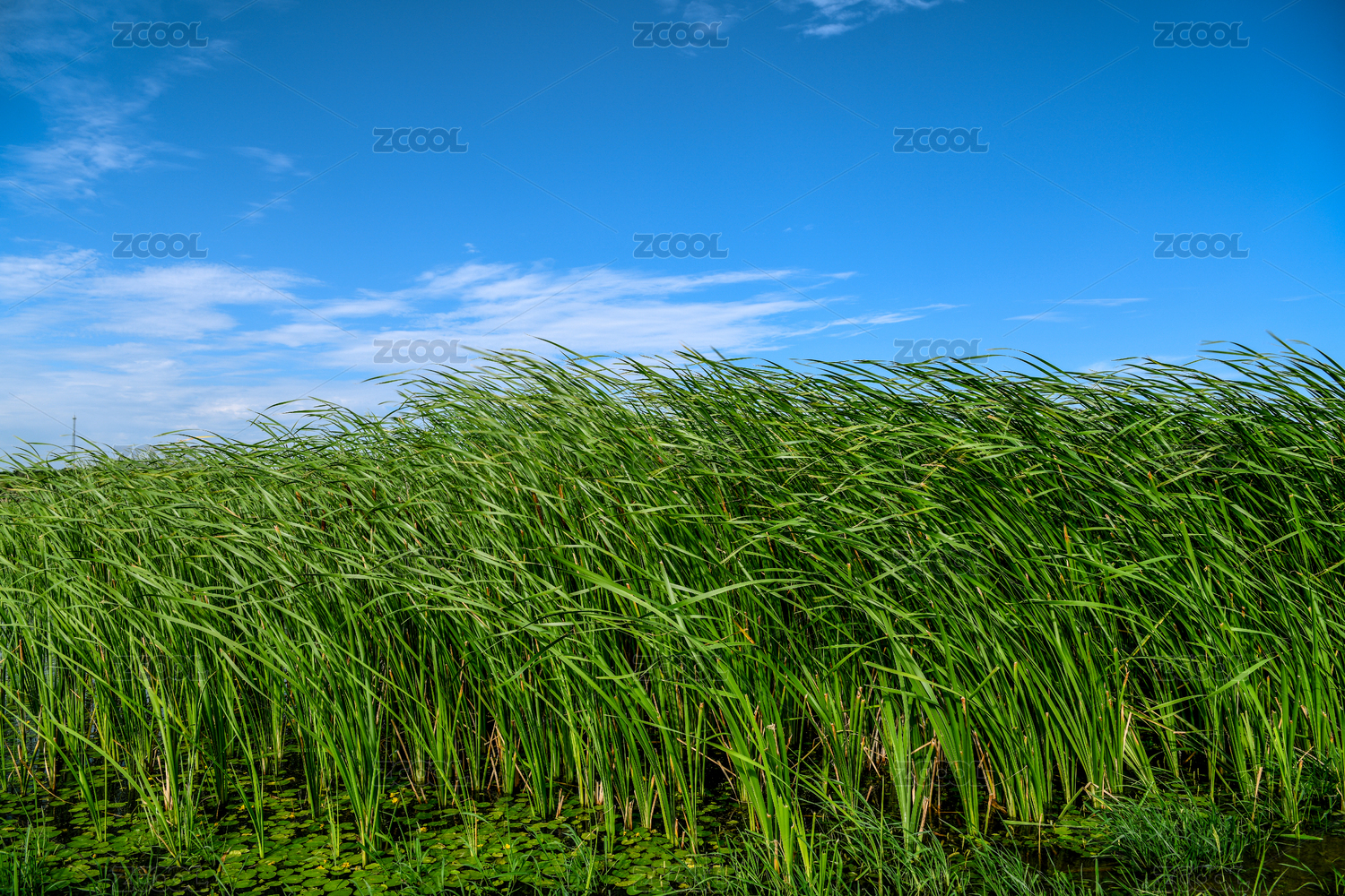 漩涡状白云及蓝天白云映衬下的芦苇和绿树