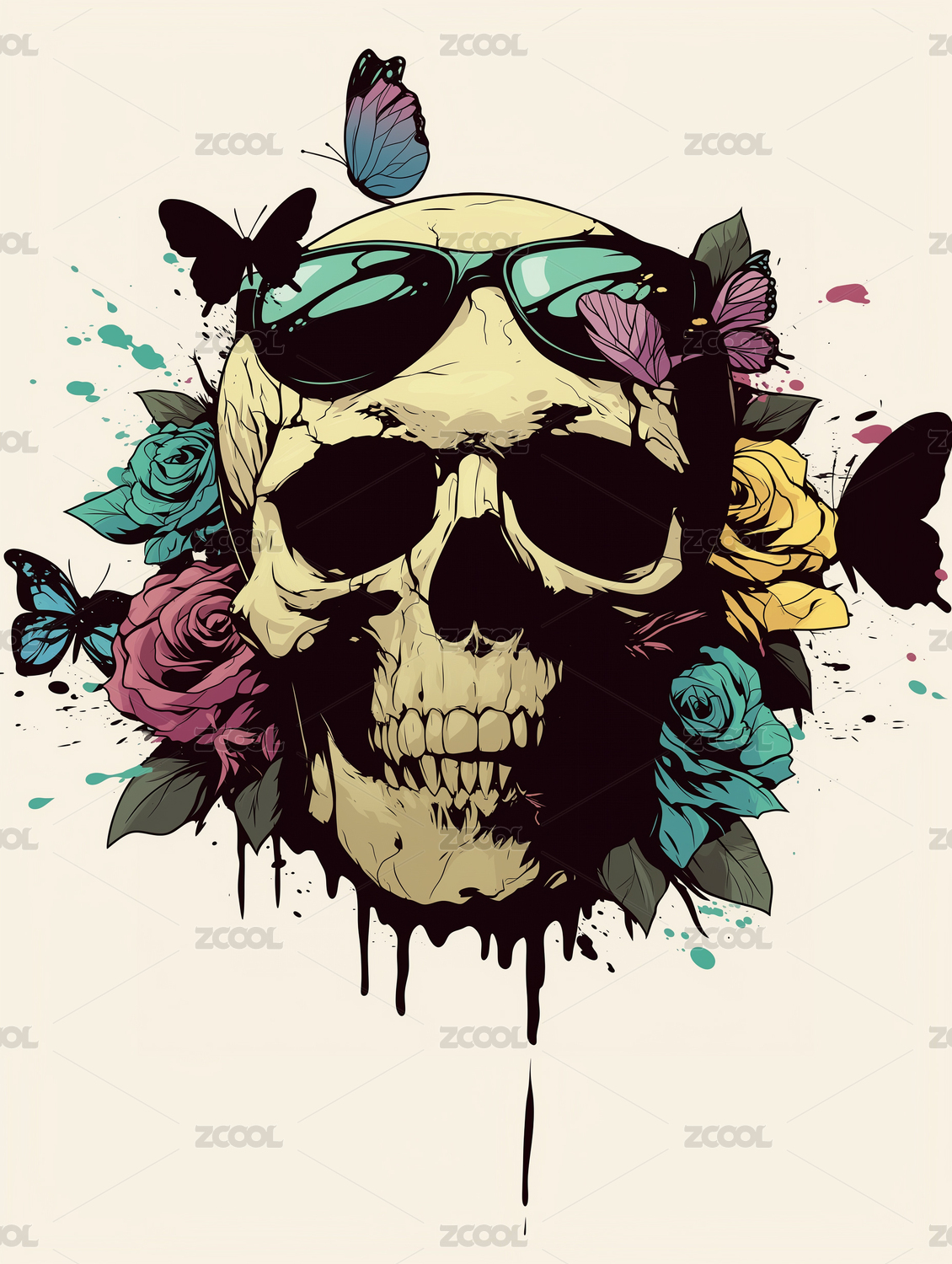 骷髅头玫瑰花蝴蝶暗黑风潮流插画