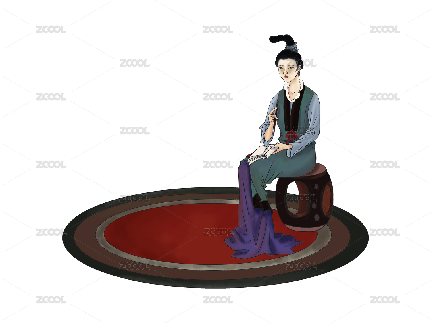 水墨古风人物绿红橘色读书美女汉服石头兰草菊花