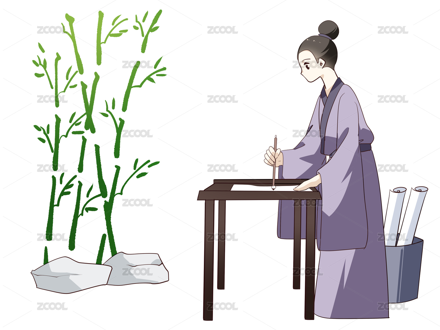 嫩绿古风水墨人物女子站在桌子边书写画画