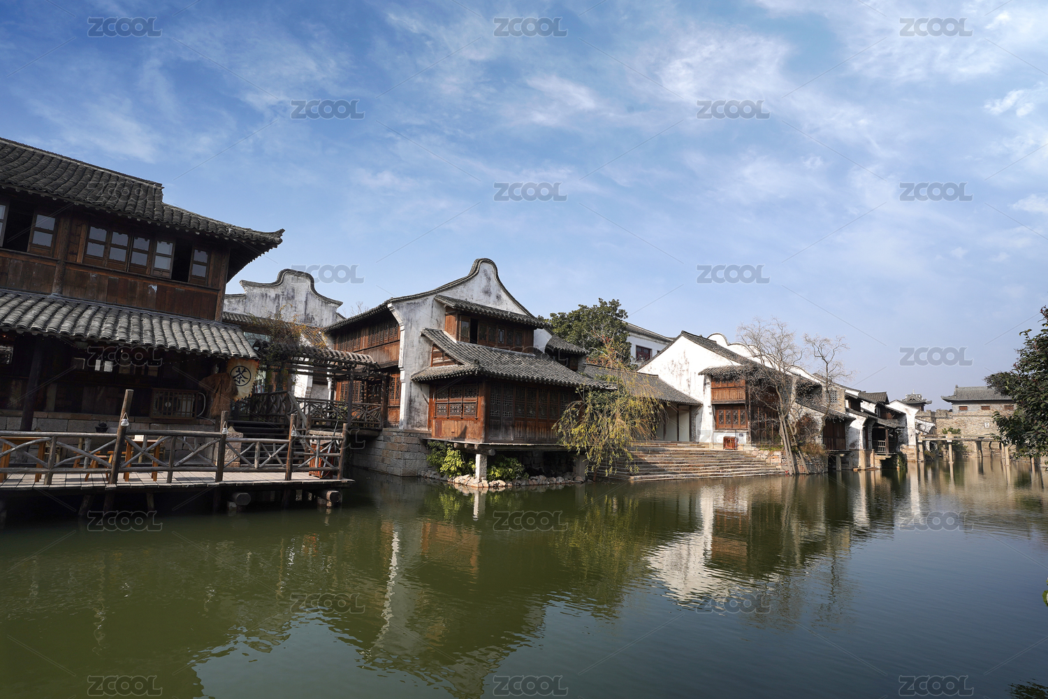 中国浙江省嘉兴市桐乡市乌镇蓝天下环湖而建的一片古代建筑群