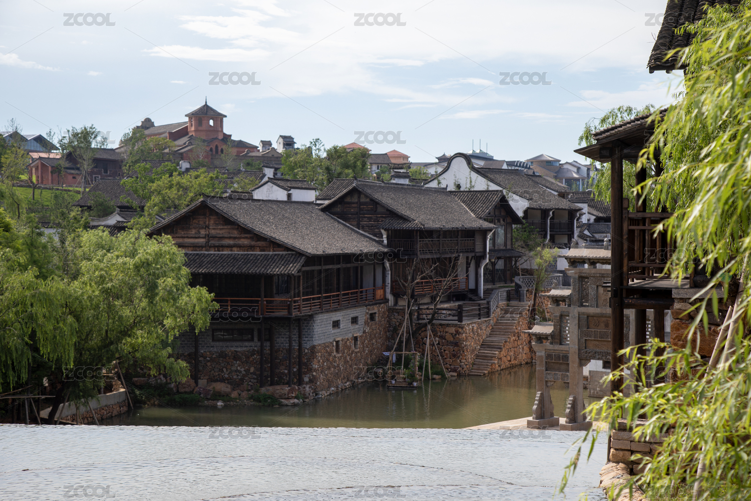 四川宜宾李庄古镇木结构青瓦房水面光影